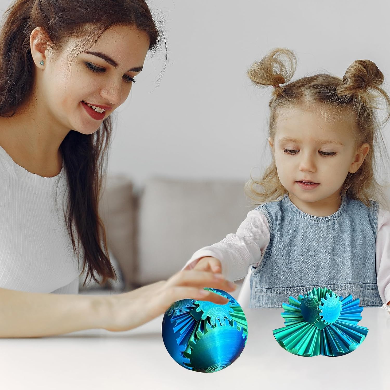 • 3D Printed Gear Balls: The 3D Gear Ball features a series of intricate interlocking gears that turn, twist, and articulate with the flick of a finger. It's like holding a small engineering marvel in your hand!