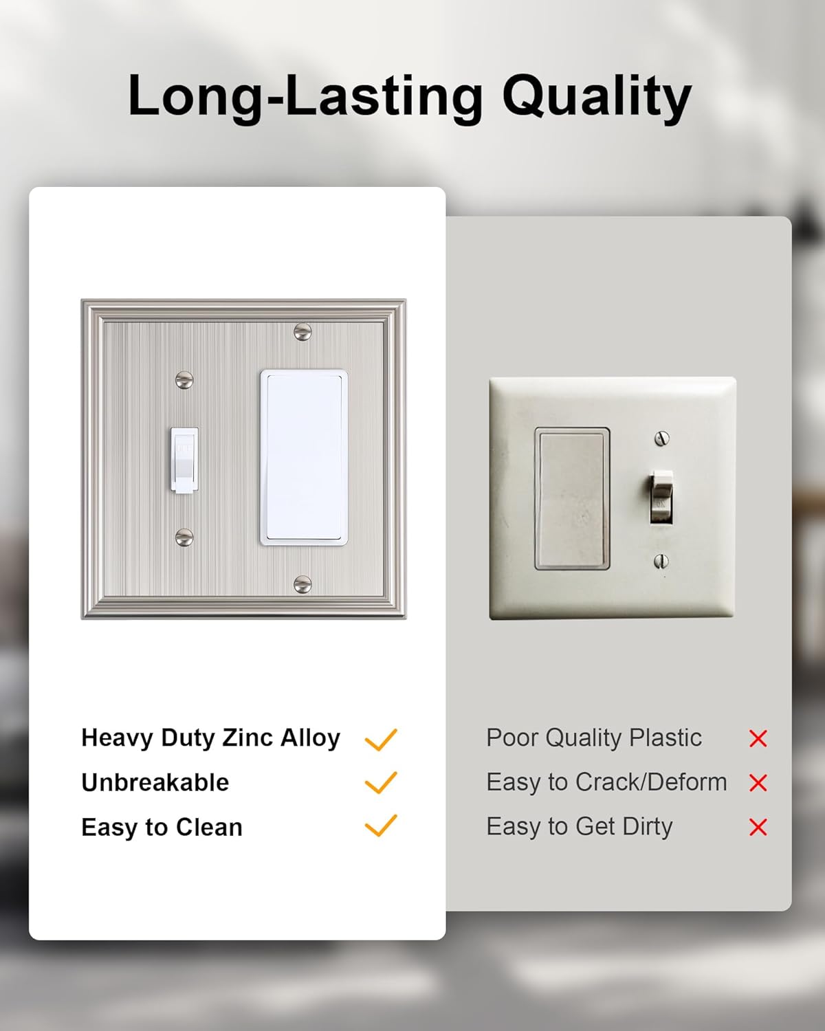 • Durable Solid Zinc Alloy - Constructed from thick and sturdy zinc alloy, the Combo Toggle/Decorator switch plate cover offers exceptional durability and sturdiness, easier to clean and maintain. It is resistant to high impact, tarnishing, and corrosion, unbreakable. Ensuring it remains its stunning appearance for years to come.