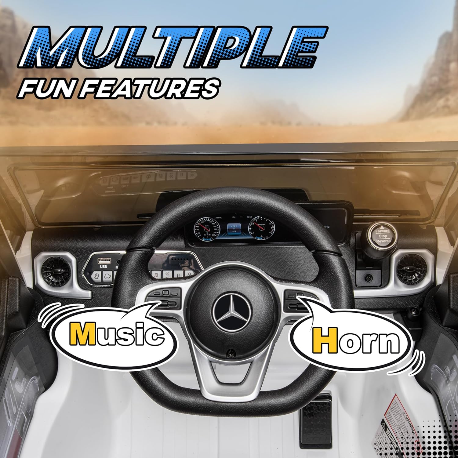• Licensed Kids Mercedes Benz G500: This Mercedes Benz kids car has a realistic look, working lights, an illuminated dashboard, and a realistic steering wheel.