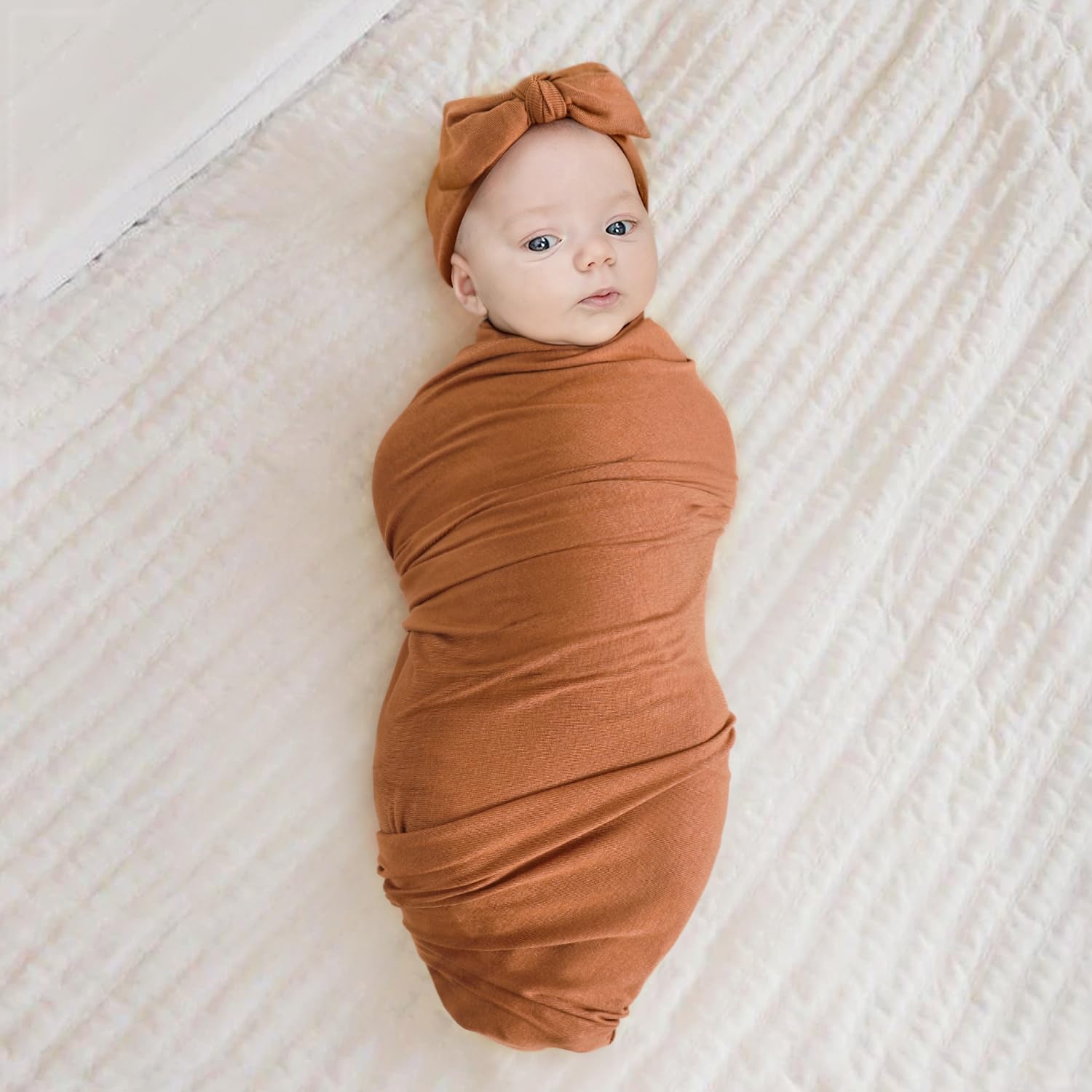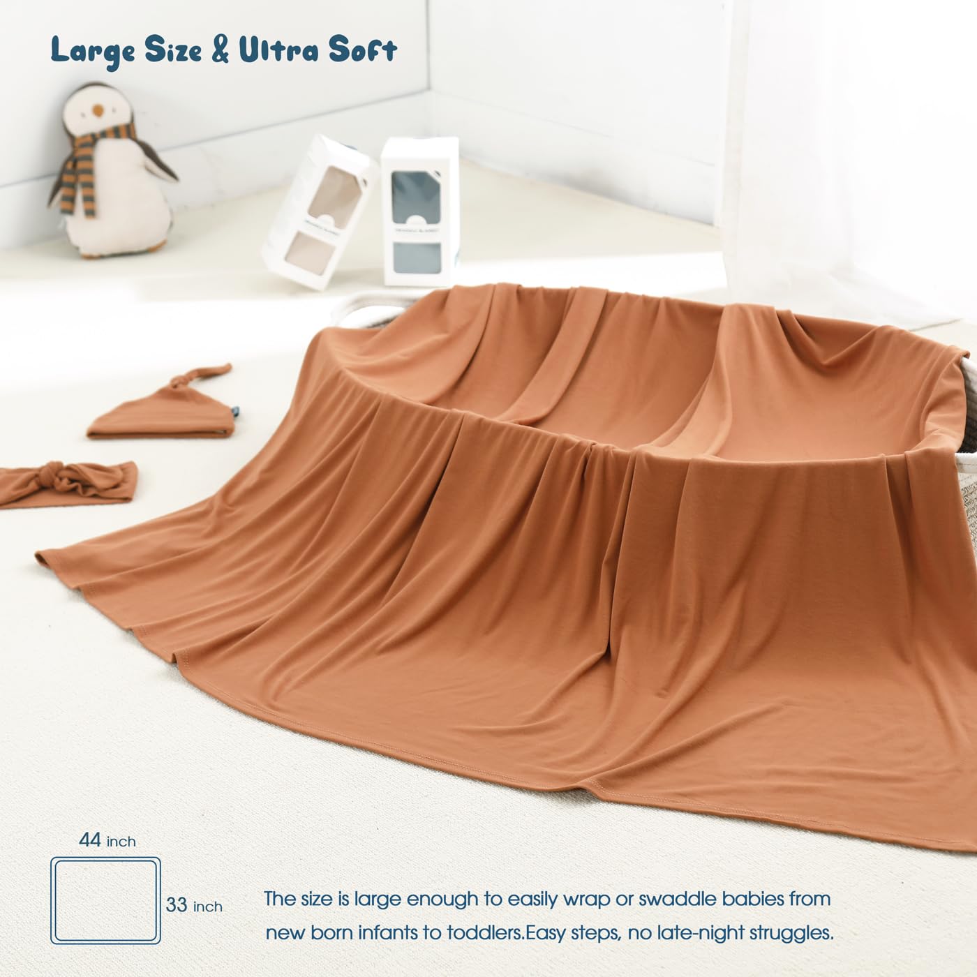 GRSSDER Newborn Swaddle Blanket, Ultra Soft Jersey Receiving Blanket with Matching Headband and Beanie Set 33×44", Stretchy Baby Neutral Swaddle Wrap for Girls and Boys