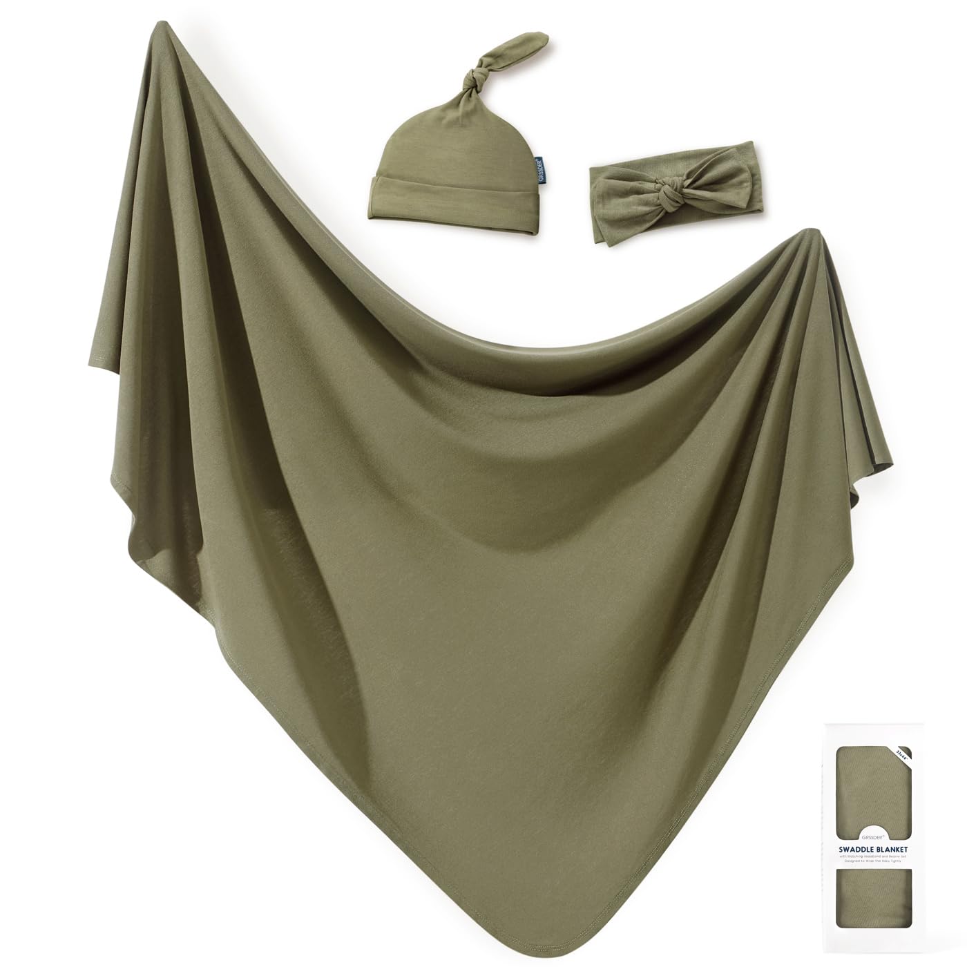 GRSSDER Newborn Swaddle Blanket, Ultra Soft Jersey Receiving Blanket with Matching Headband and Beanie Set 33×44", Stretchy Baby Neutral Swaddle Wrap for Girls and Boys