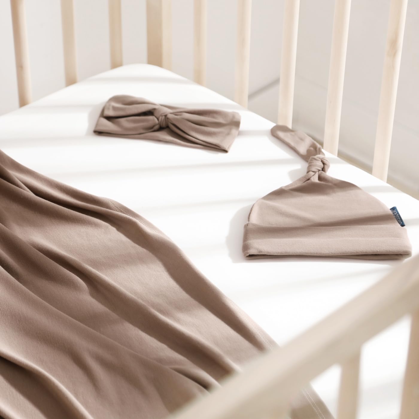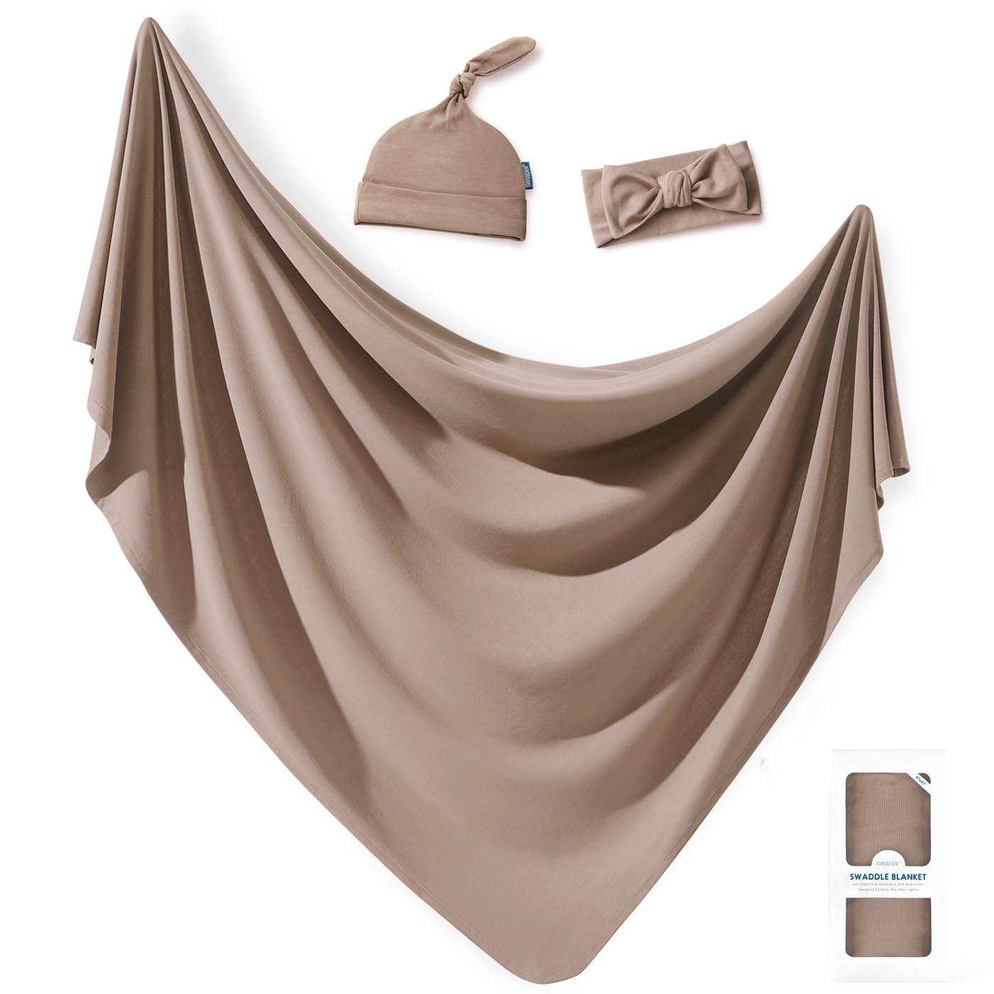 GRSSDER Newborn Swaddle Blanket, Ultra Soft Jersey Receiving Blanket with Matching Headband and Beanie Set, 47×47" Extra Large Nursery Stretchy Swaddle Wrap for Girls and Boys
