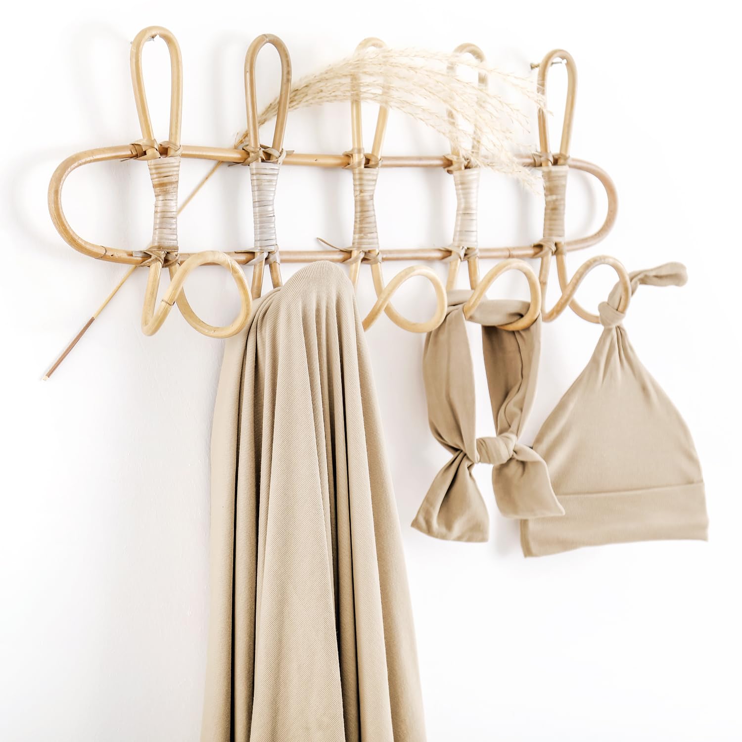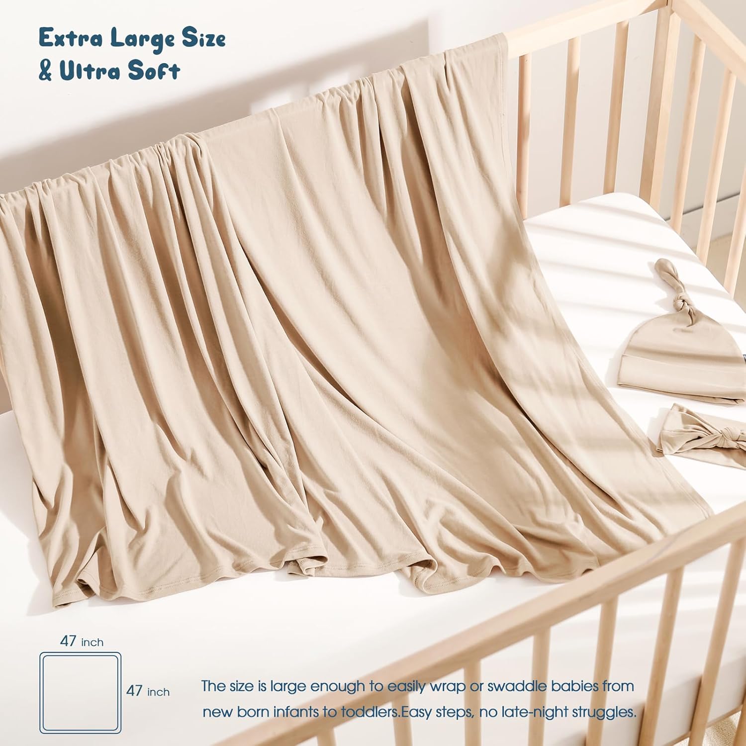 GRSSDER Newborn Blanket, Ultra Soft Jersey Receiving Blanket with Matching Headband and Beanie Set, Stretchy Baby Swaddle 47×47", Extra Large Neutral Swaddle Wrap for Girls and Boys