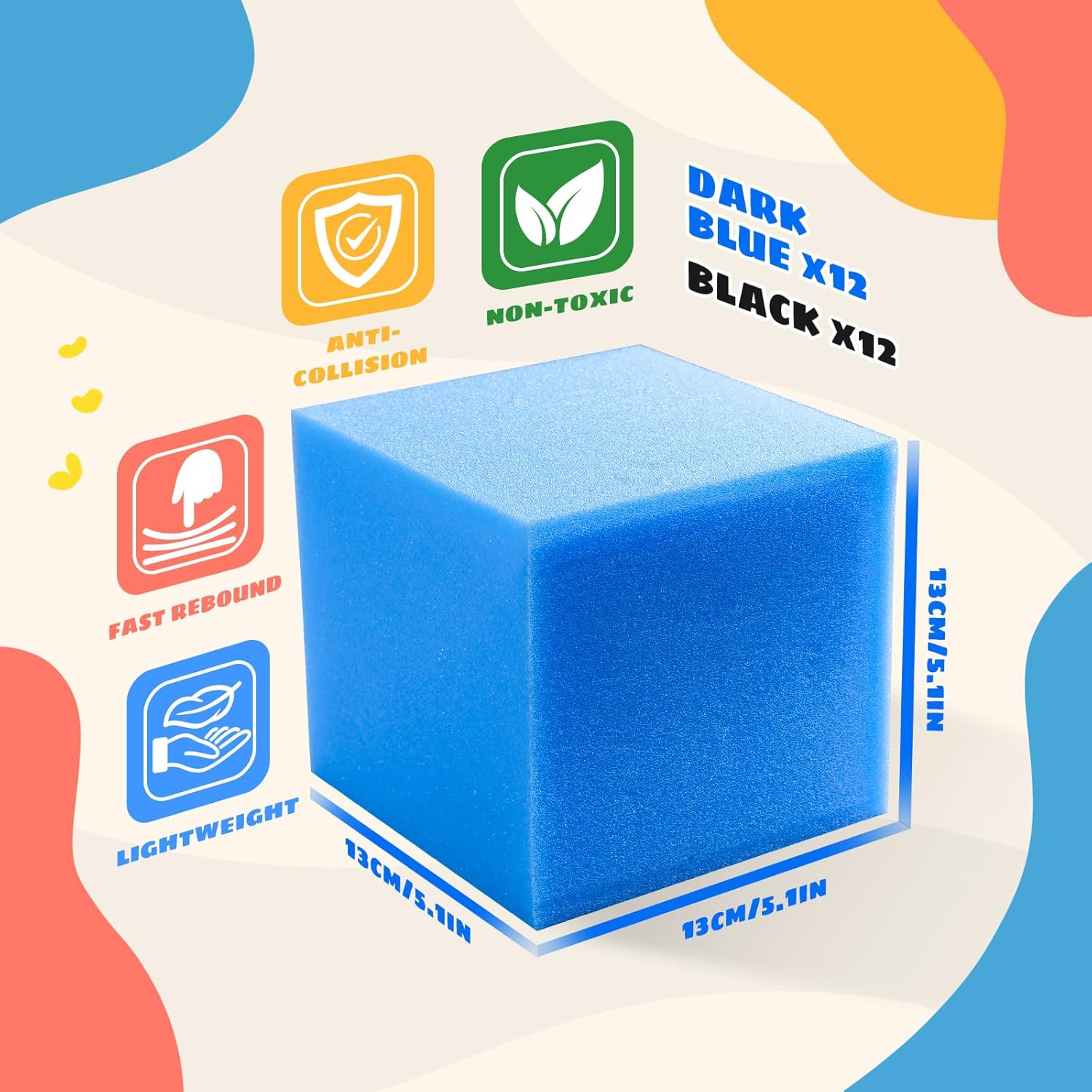 Foam Pit Cubes, 24 PCS 5 Inches Gymnastics Foam Blocks Trampoline Blocks, Multi-Sport Protective Padding for Gymnastics, Trampoline, Parkour, Skate Parks & BMX - Black & Dark Blue