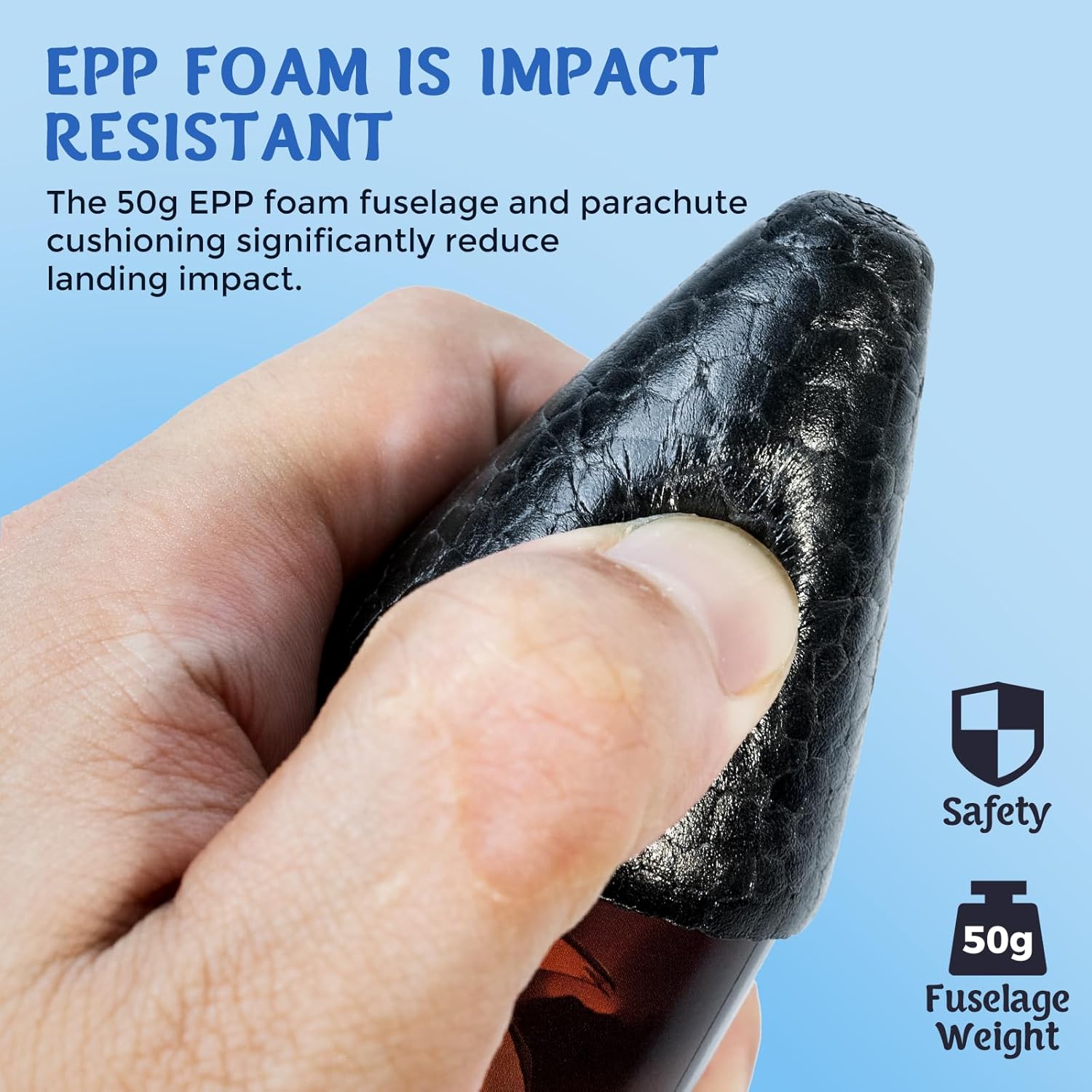 • 💪Safe and Stable Design: The upgraded circular propellers are lighter and softer, providing higher and more stable flights while being safe for kids. (Propellers must be installed before use. The lightweight EEP foam body boosts launch height, and the parachute deploys automatically at peak altitude for a smooth landing.