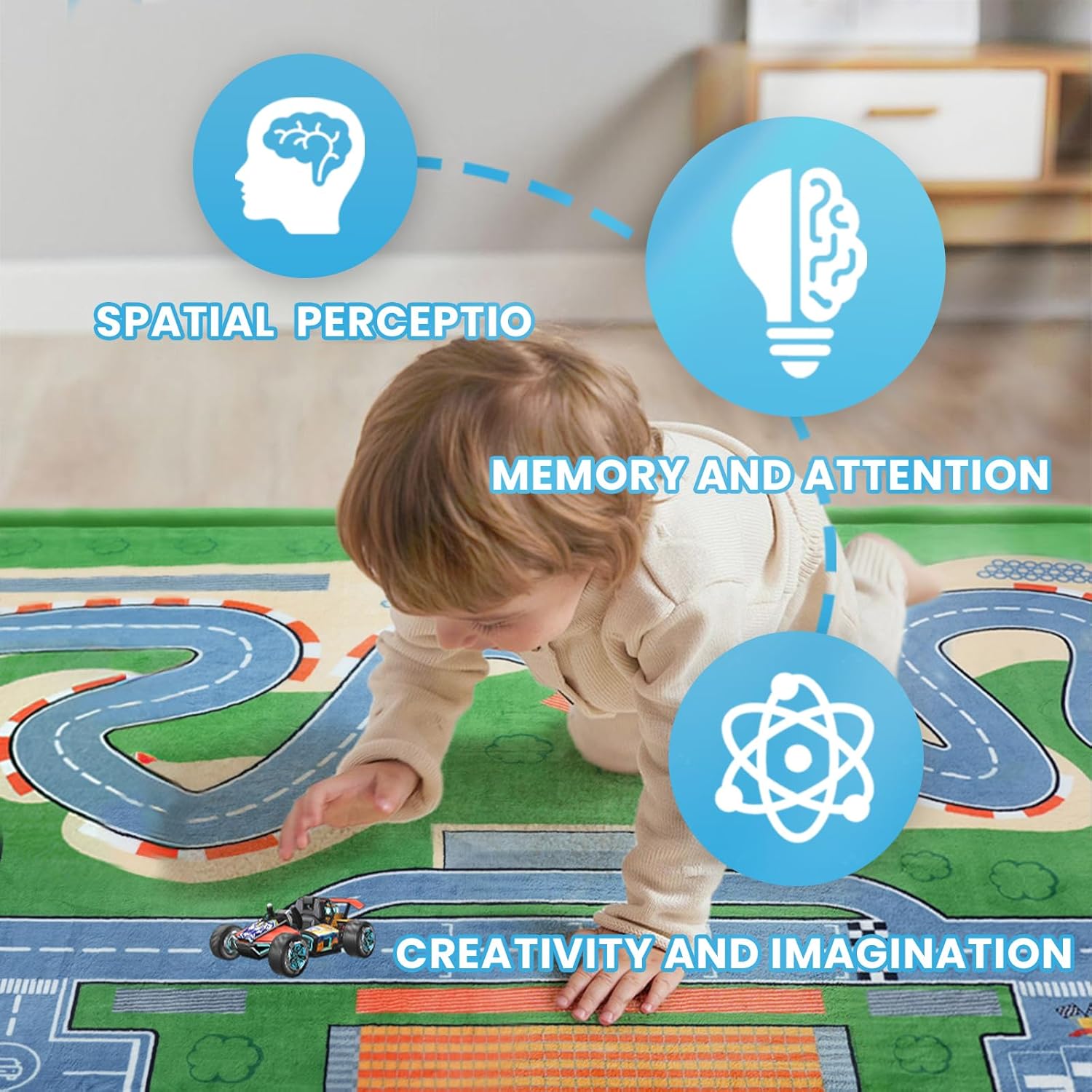 • Fun Educational Race Track Design: This vibrant car rug stimulates imagination and learning. Perfect as a classroom rug or playroom rug, it helps develop spatial awareness and creativity in toddlers and young children