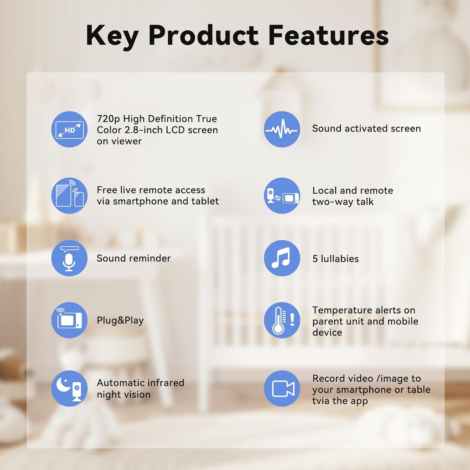 - 【WIFI BABY MONITOR】: This Video Baby Monitor Has a 2.8” Screen .That Connects to Our App Via Wi-Fi to Enable HD 1080p Video And Provides a Secure, Private Connection. Fully Charged Remote Has a 10 Hour Battery.