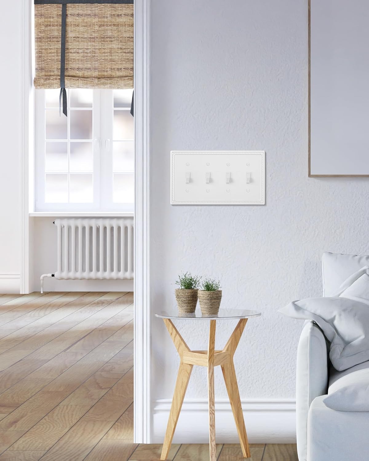 • Timelessly Elegant - The quad light switch plate covers feature an exquisite pure white finish with a traditionally styled beaded border. Offering a functional yet elegant enhancement to your home decor. Stylish wallplate effortlessly blends practicality with a refined decorative accent and sophisticated charm.