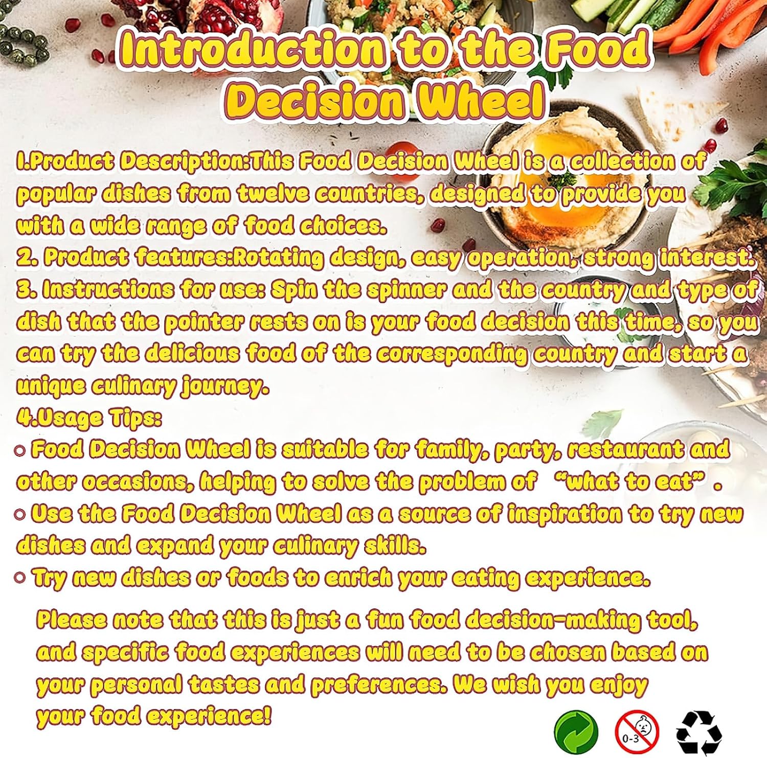 - Date Night Gift: Say goodbye the what to eat troubles - fidget spinner toy will help you make decision easier, date night or give surprise your loved one with this unique gift ideas. Simply turn this food decision game gently, and the moment the needle stops, the countries and dishes on the wheel are your food choices for this time, as the finger food spinners toy guides you on a unique gastronomic journey through the flavourful dishes from different countries.