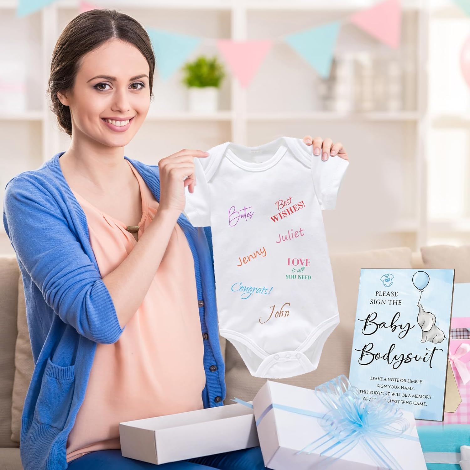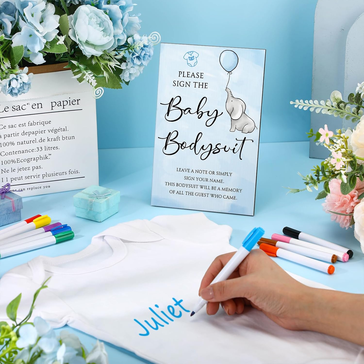 Qunclay 12 Pcs Baby Bodysuit Baby Shower Game Include 1 Game Wooden Sign Tabletop Decor 1 White Blank Newborn Bodysuit 10 Fabric Marker for Gender Reveal Party(Elephant)