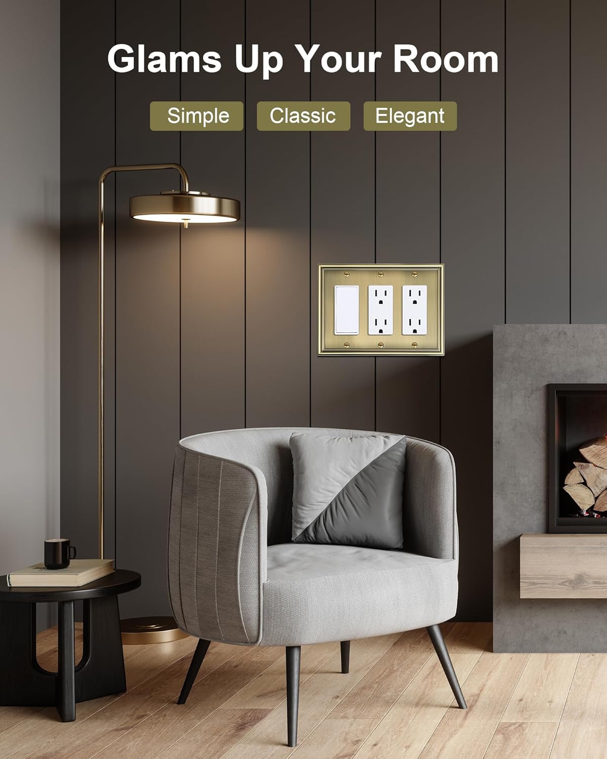 • Wide Application - Versatile and easy to match, These brass wall plates are compatible with Decorator Outlet Receptacle, Roker Switch, Dimmer Switch, GFCI Outlets. Complements any interior style, whether your decor is modern, traditional, or contemporary, this decorative switch plate cover seamlessly blends in and glams up your wall.