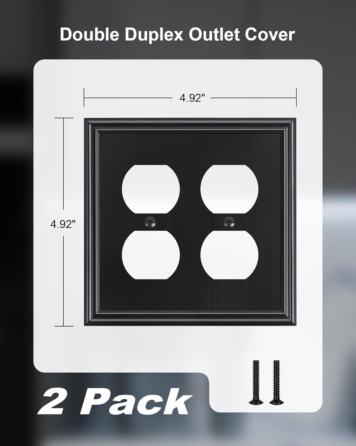 • Specification - Pack of 2 double duplex metal wall plates, size at 4.84''W*4.92''H. Easy replacement of any wall plate with the same configuration, making it a convenient choice for remodeling or upgrading your home. Backed by a one-year warranty to ensure your peace of mind and complete satisfaction.
