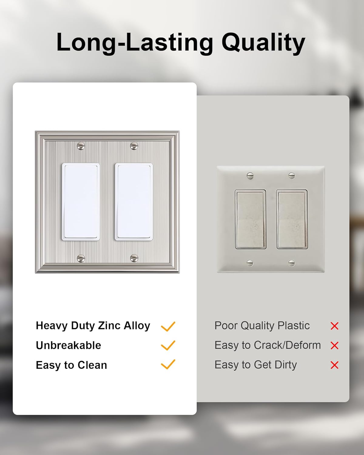 • Durable Solid Zinc Alloy - Constructed from thick and sturdy zinc alloy, the double switch plate covers offers exceptional durability and sturdiness, easier to clean and maintain. It is resistant to high impact, tarnishing, and corrosion, unbreakable. Ensuring it remains its stunning appearance for years to come.