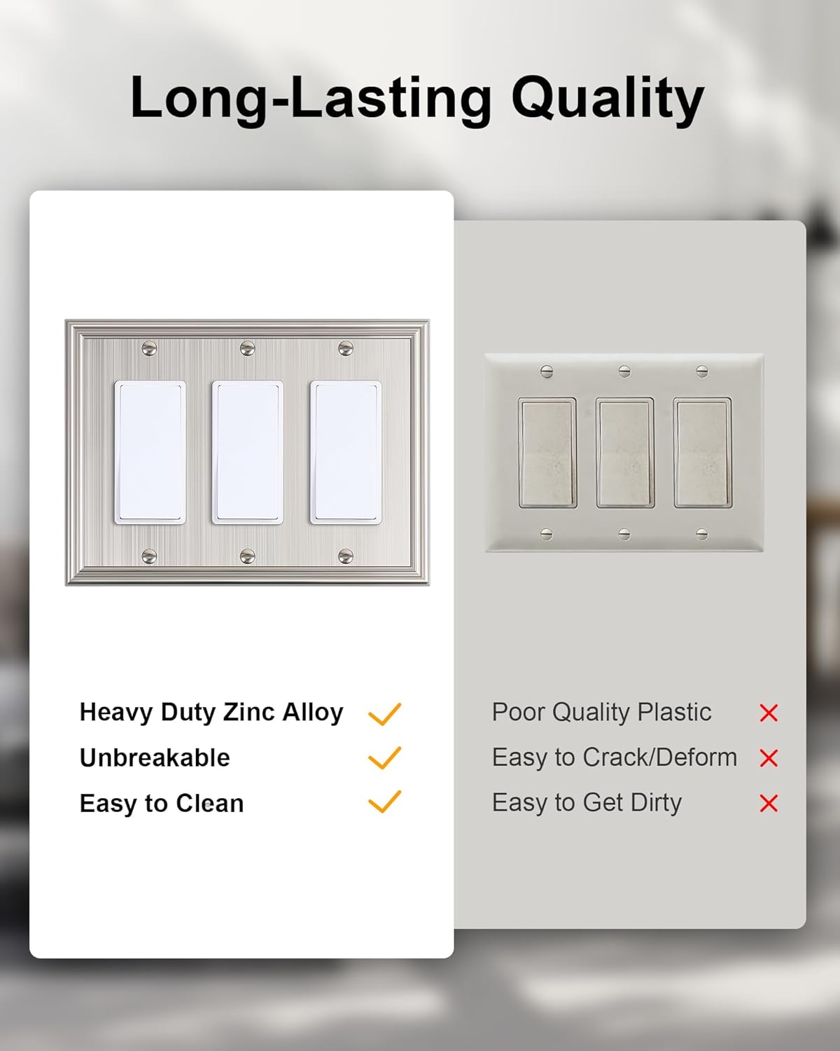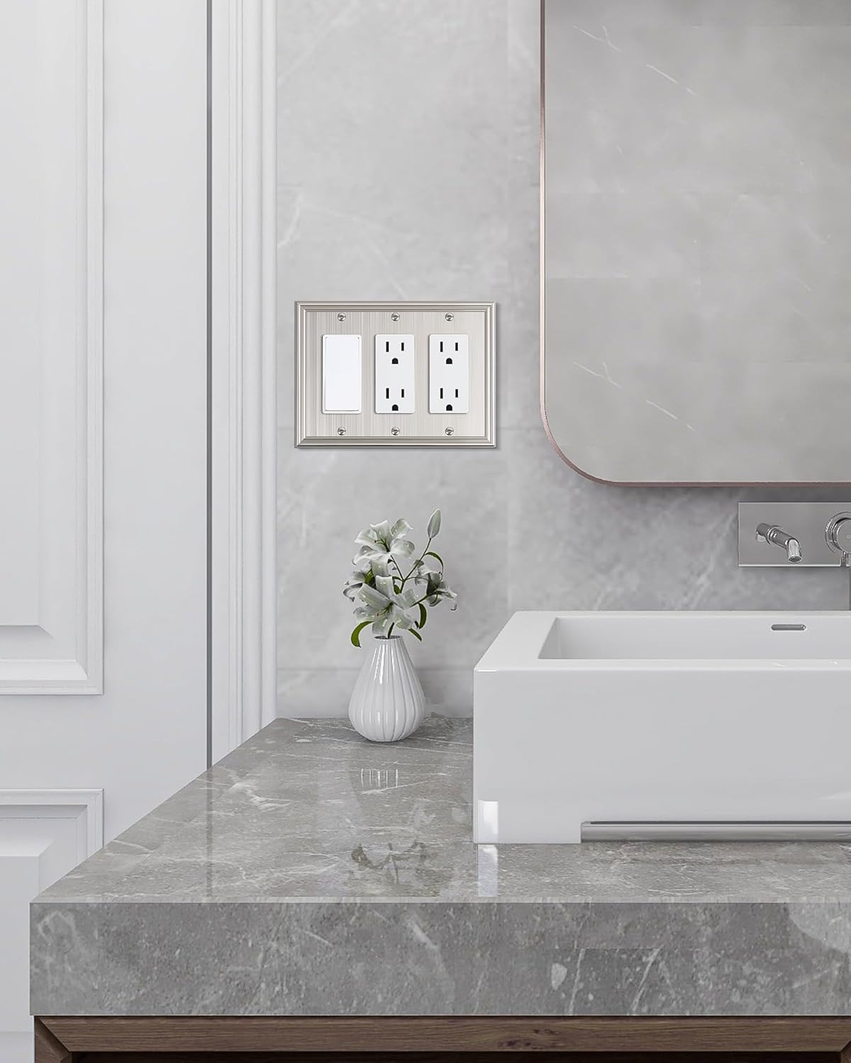 • Wide Application - Versatile and easy to match, These brushed nickel wall plates are compatible with Decorator Outlet Receptacle, Roker Switch, Dimmer Switch, GFCI Outlets. Complements any interior style, whether your decor is modern, traditional, or contemporary, this decorative switch plate cover seamlessly blends in and glams up your wall.