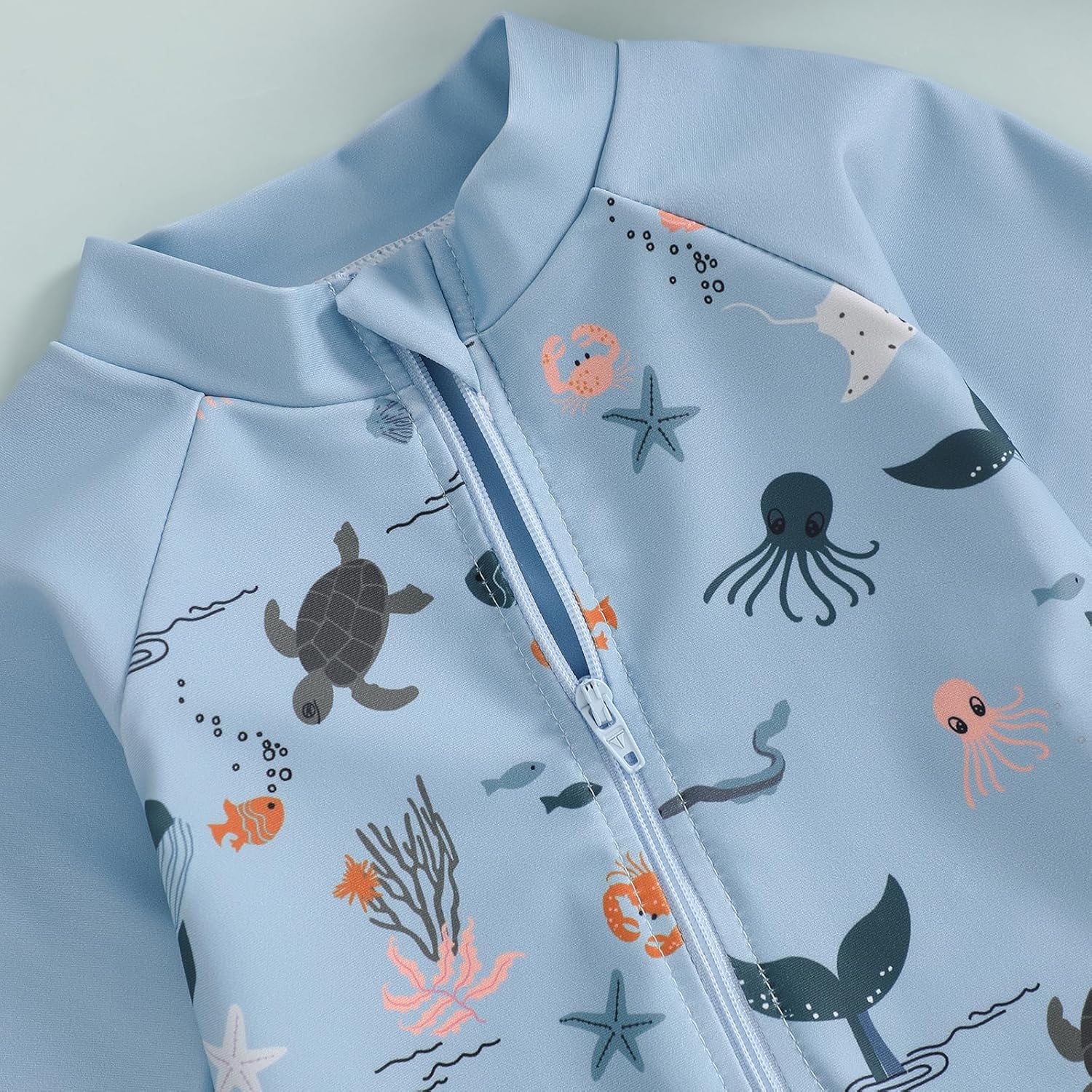 • Design: Toddler bathing suit boy, infant long sleeve swimsuit boy, round neck, back/front zipper closure for easy on and off, newborn swimsuit boy, dinosaur/marine animal print, super cute and lovely, your little boy will stand out in the crowd