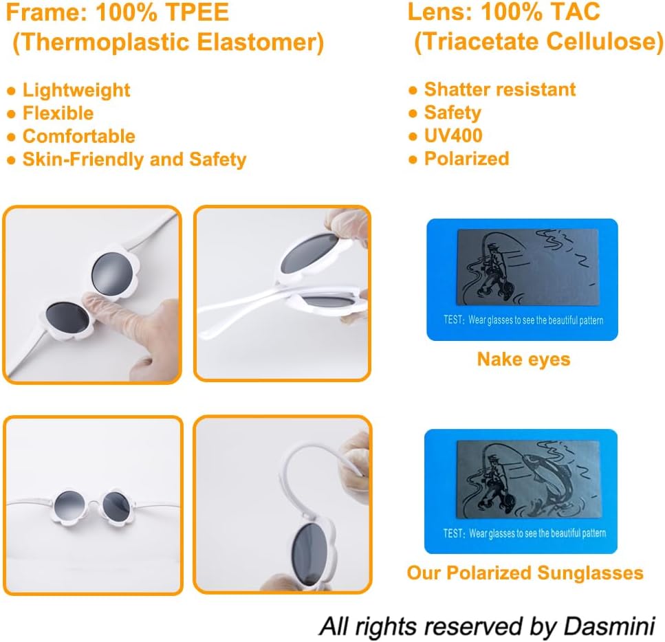 • PREMIUM BABY SUNGLASSES QUALITY:TPEE frame which is flexible and sturdy for baby's safety.Adjustable Attachable Strap securely holds the sunglasses in place.TAC shatter resistant lenses give ultra-protective and our UV400 lenses provide 100% UVA and UVB defense against harmful rays.The Polarized lenses eliminate the amount of reflected light entering the eyes.