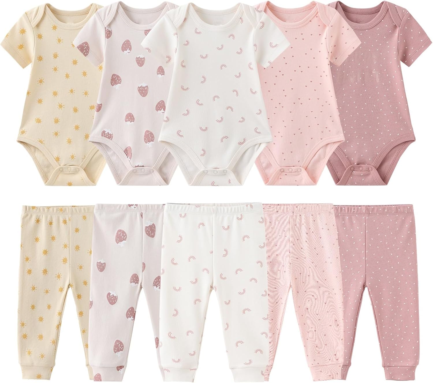 • Packing: This set comprises 5 short-sleeved bodysuits and 5 pairs of pants.
