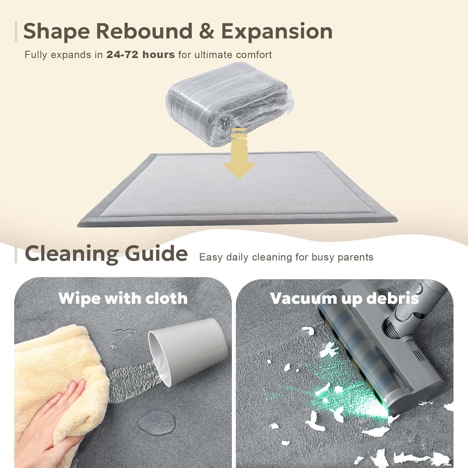 - EASY DAILY CARE: For everyday care, simply pat the surface to remove dust or use a vacuum with a soft brush attachment, gently following the velvet grain. It's an easy routine that helps keep your little one's world soft, smooth, and ready for play. To ensure safe transport, this baby play mat arrives vacuum-sealed, please allow 24 to 72 hours for the thick play mat for baby to fully expand to its original, cloud-like thickness