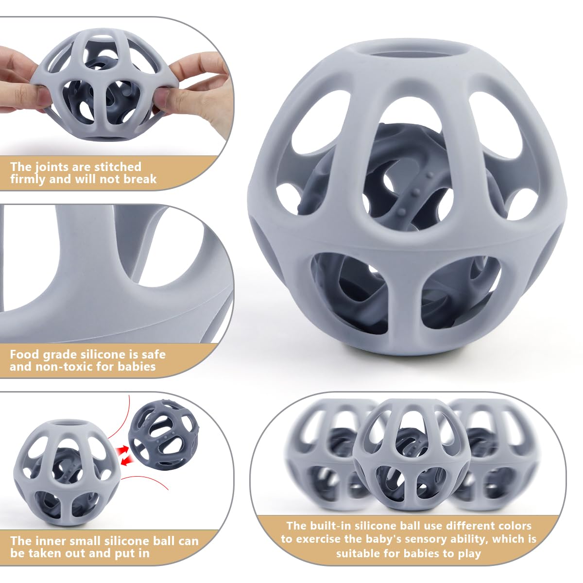 - 【Easy to Grasp & Hold】Designed with tiny hands in mind, this baby ball toy features a size and finger holes that's easy for infants to grasp, promoting motor skill development and sensory exploration. All teether balls do not have small part plugs to avoid the danger of choking hazard. Weight: 76g/2.68oz