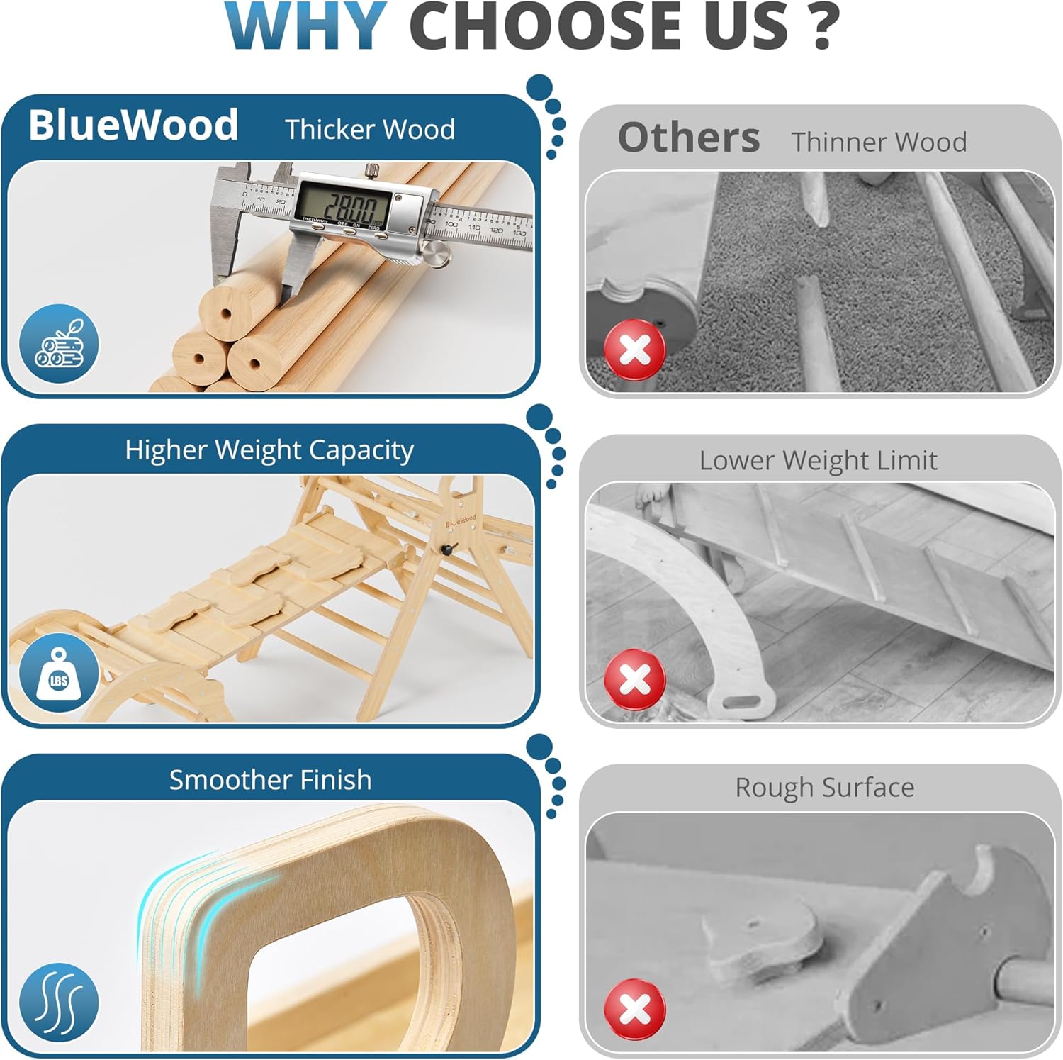 BlueWood 10-in-1 Pikler Triangle Set, Toddler Climbing Toys Indoor, Montessori Climber, Baby Jungle Gyms with Arch, Extra Rope Ladder & Footprint Balance Beam - Natural Rustic