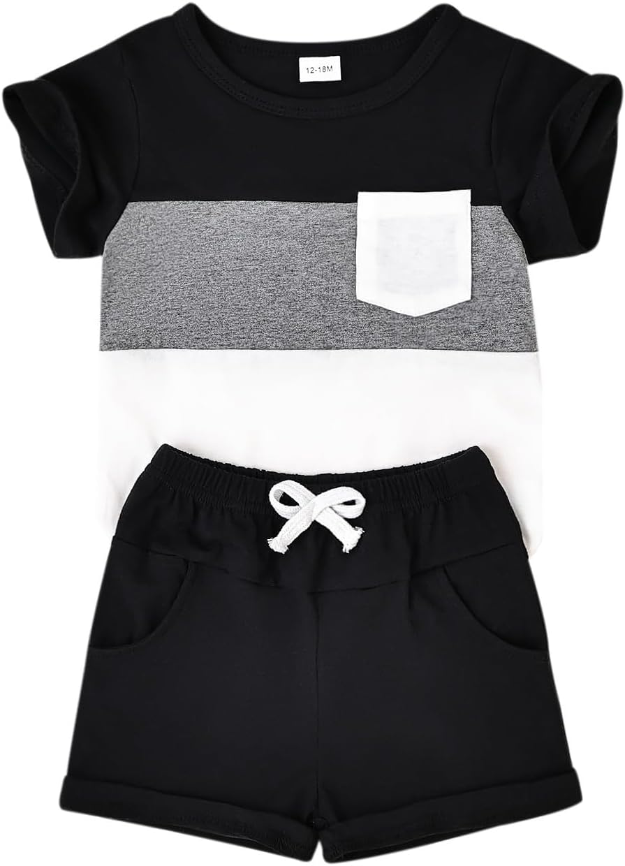 • ✯ Fashion Stitching and Contrasting Color Design: The top t-shirt has a cute little pocket in the front and comes in a variety of contrast colors, giving your sweet toddler baby boy a stylish look this summer. The solid shorts feature a high-quality elastic waistband and convenient side pockets, perfect for your little guys to put things such as while on the go.