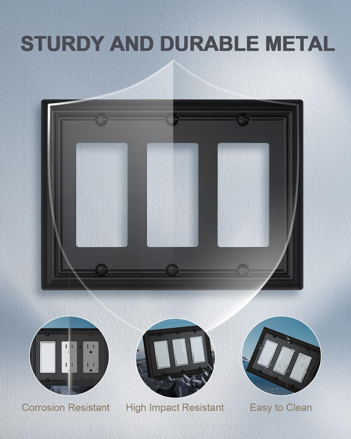 • 【Modern Design】Featuring stylish and charming black finish, ZILLSEA 3-gang decorator wall plate coordinates with your home decor and adds texture and elegance to your space