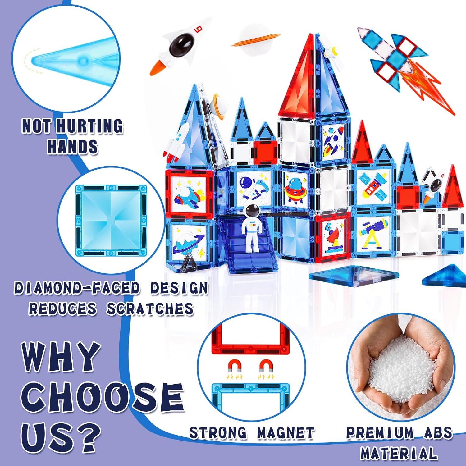 Magnetic Tiles - 58 Pcs Space Magnets Building Blocks Set - Sensory Travel Toys for Toddler - STEM Construction Playboards Stacking Toy - DIY Window Art - Birthday Gifts for Boy, Girl, Kids Ages 3-12