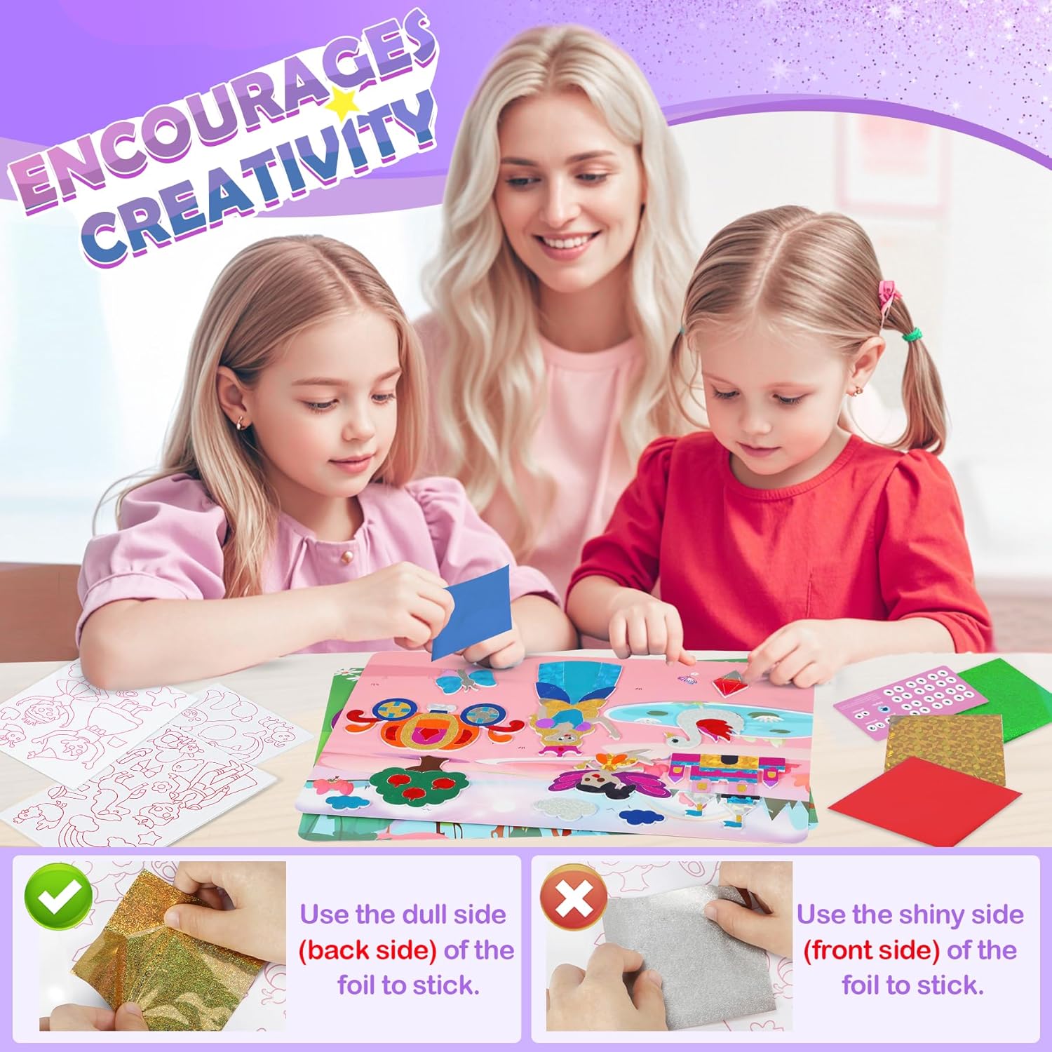 Foil Arts and Crafts for Kids Ages 4-8, Large Size Princess Fun Foil Art Craft Supplies Kits, No Mess DIY Creative Activity Travel Toys, Foam Sticker Coloring Books,Party Favor Birthday Gifts for Kids