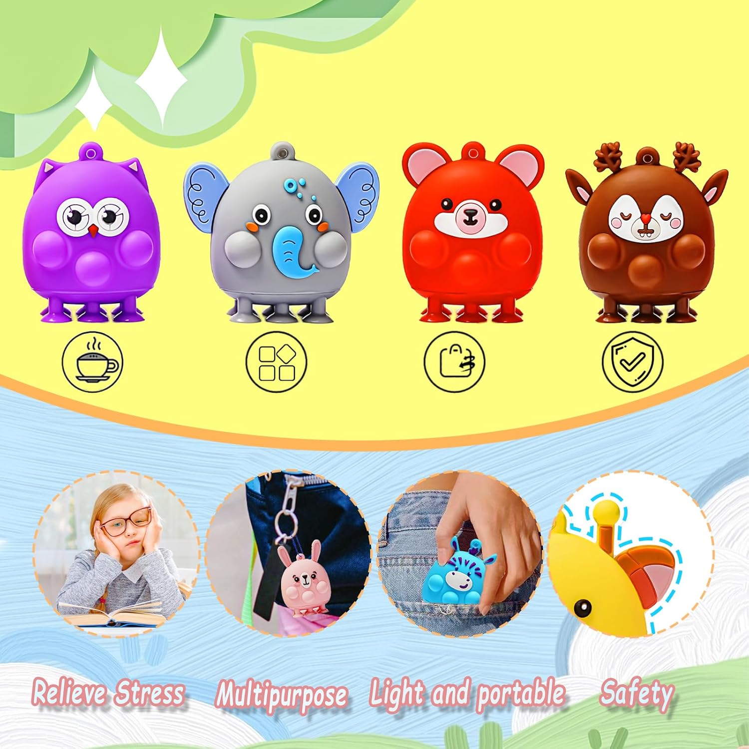 • KIDS FIDGET SUCTION TOYS: This package has some cute elephant *4, rabbit *4, penguin *4, bear *4, owl *4, giraffe *4, zebra *4, elk *4, a total of 32 well-designed styles. Squeeze the bubbles to make a "POP" sound! The bottom suction cup can be firmly attached to the glass and other places. The combination of fidget bubble toy and suction cup toy will help you unlock more new ways to play!