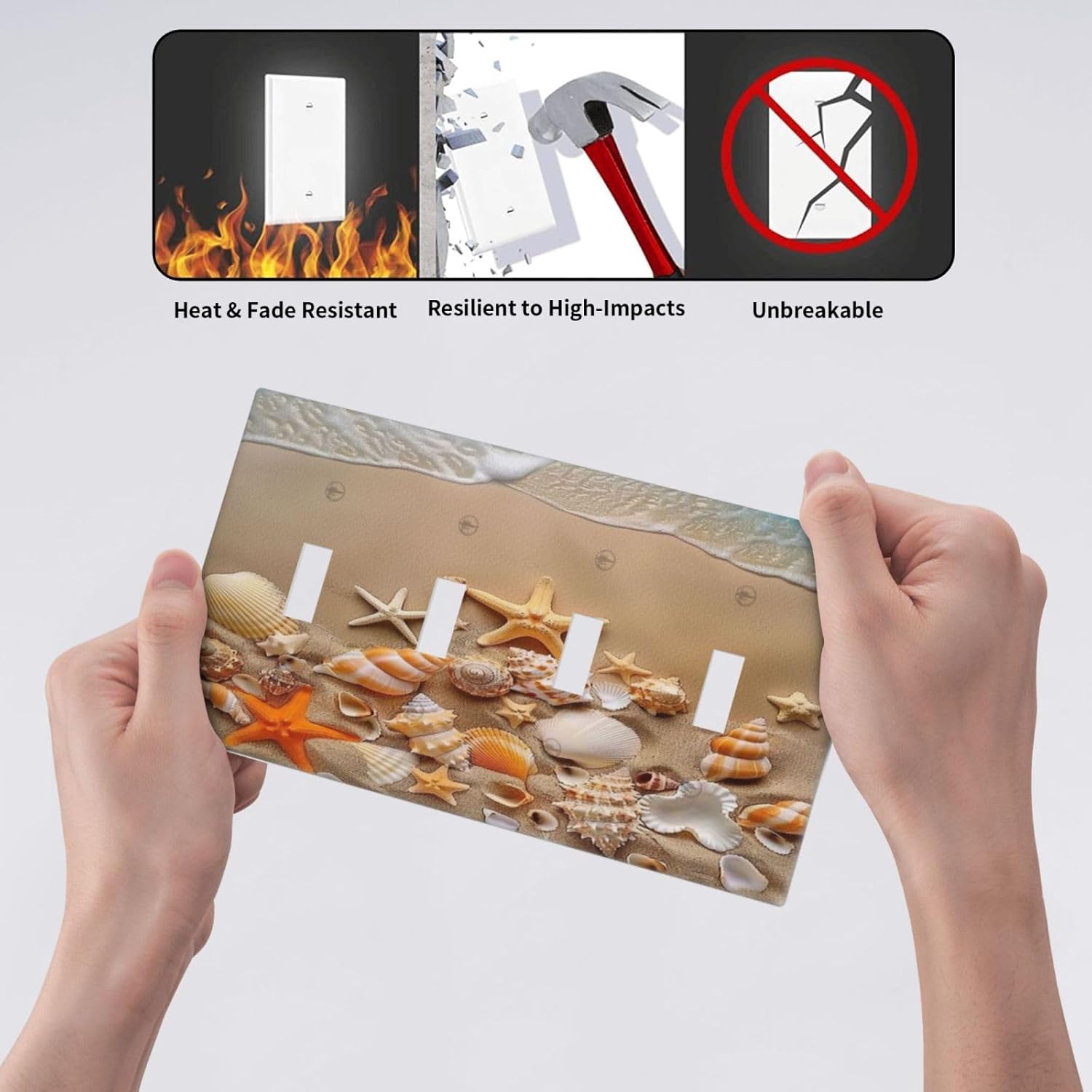 Decorative Switch Covers Plate Beachy Sea Ocean Seashell Starfish 4 Gang Artistic Wall Plate Unique Quad Toggle Light Switch Plate Jumbo Faceplate for Bathroom Bedroom Home Decor