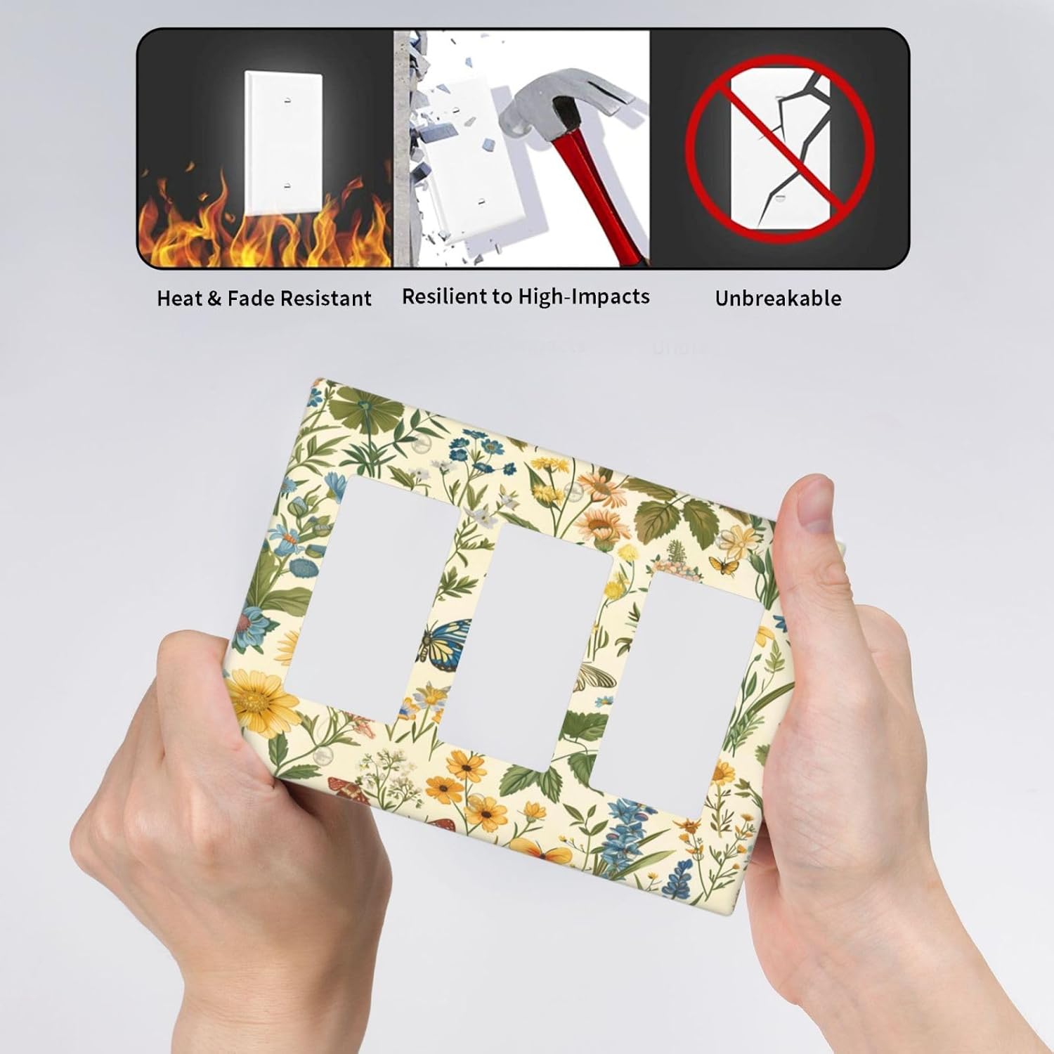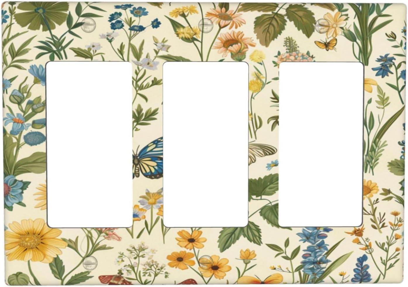 Decorative Outlet Covers Rustic Plant Garden Leaf Flower Butterfly 3 Gang Wall Plate Triple Rocker Light Switch Cover Plate Jumbo Electrical GFCI Faceplate for Bedroom Home Decor