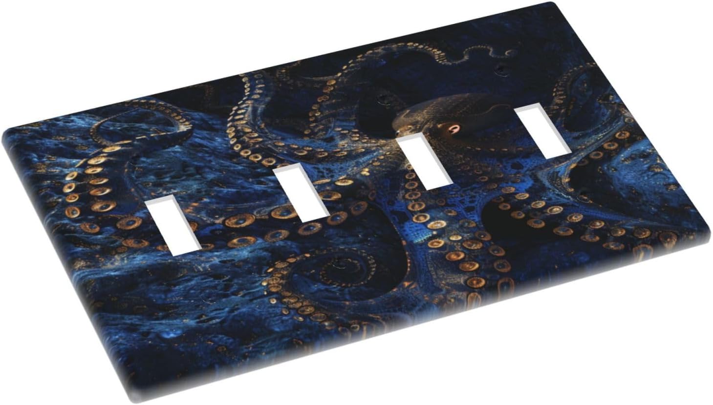 Decorative Switch Covers Plate Horror Night Blue Ocean Evil Octopus 4 Gang Artistic Wall Plate Unique Quad Toggle Light Switch Plate Jumbo Faceplate for Bathroom Bedroom Home Decor