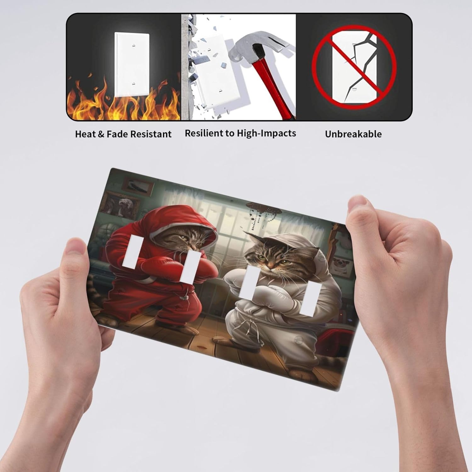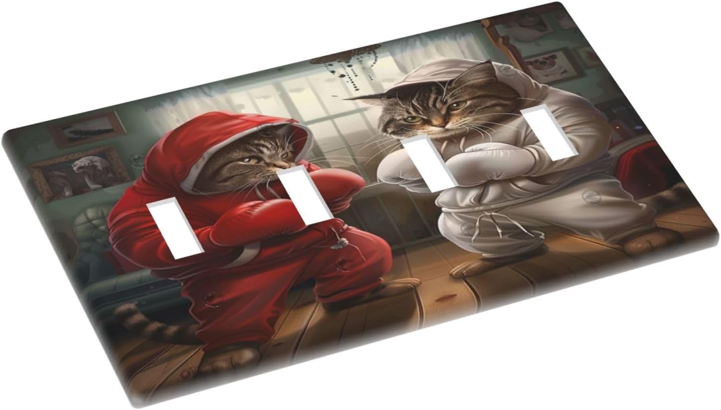 Decorative Switch Covers Plate Funny Red Boxing Cats White Tomcat 4 Gang Artistic Wall Plate Unique Quad Toggle Light Switch Plate Jumbo Faceplate for Bedroom Home Decor