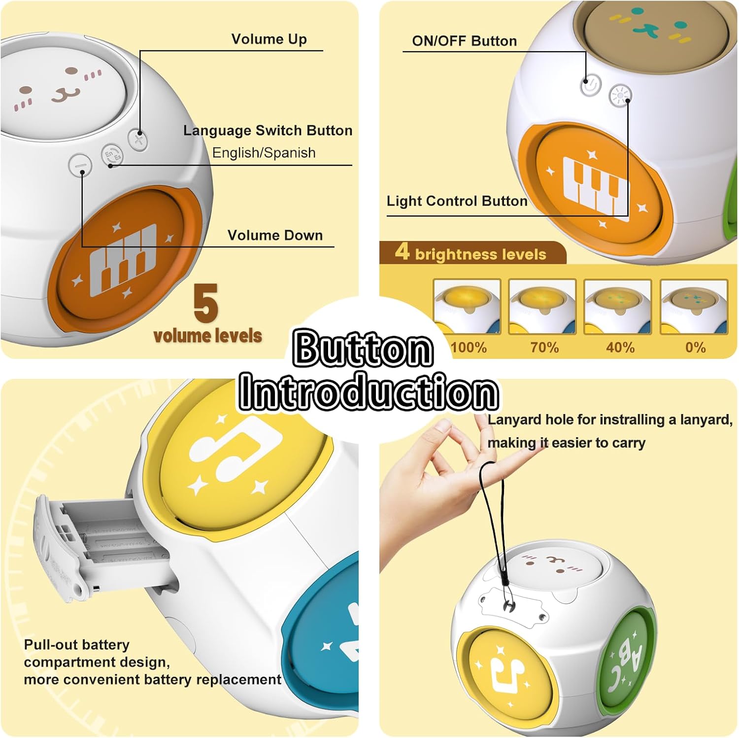 • Bilingual Early Learning: Switch between English and Spanish modes to introduce toddlers letters (A-Z), numbers (1-10), 14 animal sounds, and 7 instrument tunes—perfect for bilingual households or language development. 10 cheerful melodies and 8 colorful lights engage auditory and visual senses, keeping babies to entertained for hours