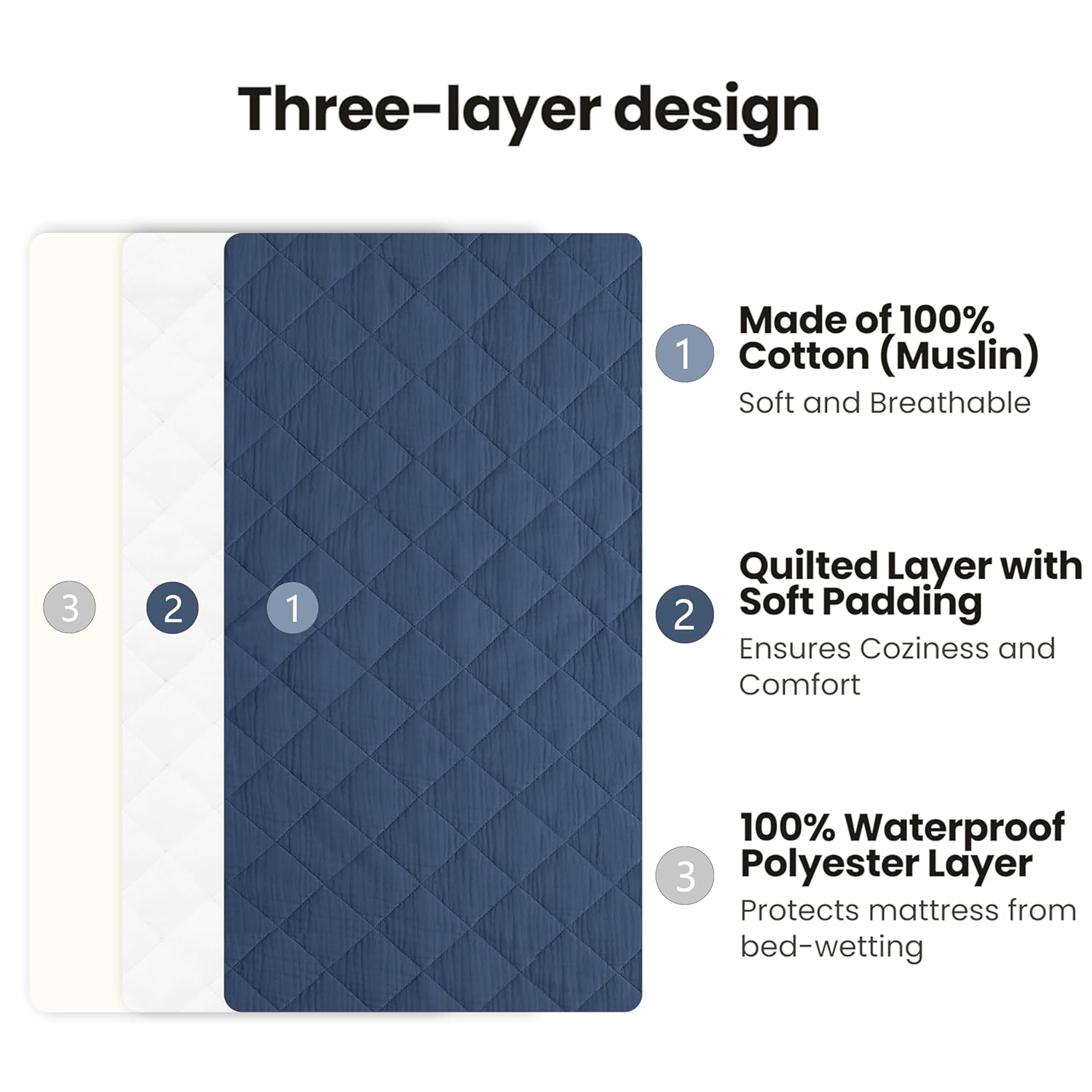 • Quilted and Soft Fabric: Our changing pad cover consists of three layers: the top layer is made of 100% cotton (muslin), which is soft and absorbent; the middle layer is quilted with soft padding to ensure coziness and comfort; and the bottom layer is made of 100% waterproof polyester to protect the pad from wetting. Our unique design provides a comfortable touch for your baby while ensuring waterproof functionality, making our changing pad soft and perfect for delicate baby skin