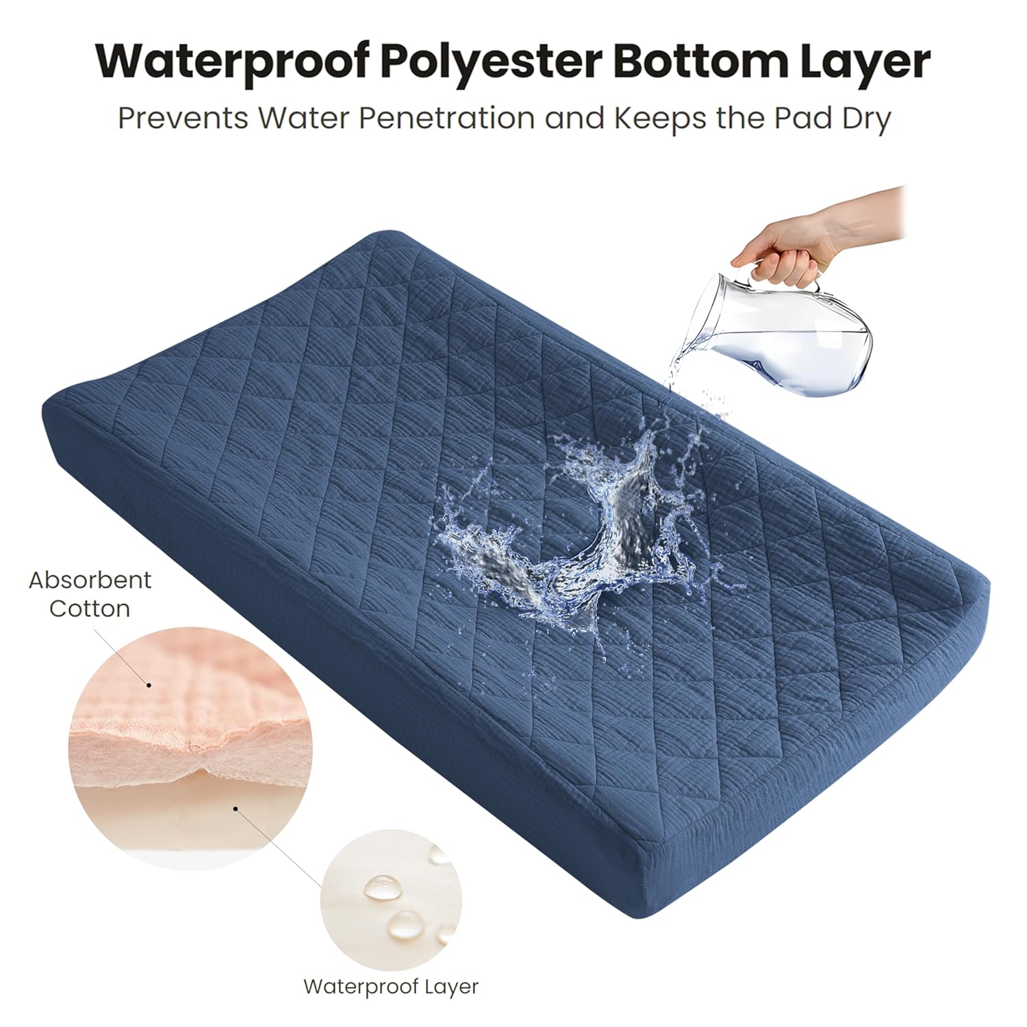 Konssy Waterproof Muslin Changing Pad Cover 2 Pack, Quilted Cotton Fitted Diaper Changing Table Cover, Soft Changing Pad Sheets for Girls Boys (Navy,Cream)