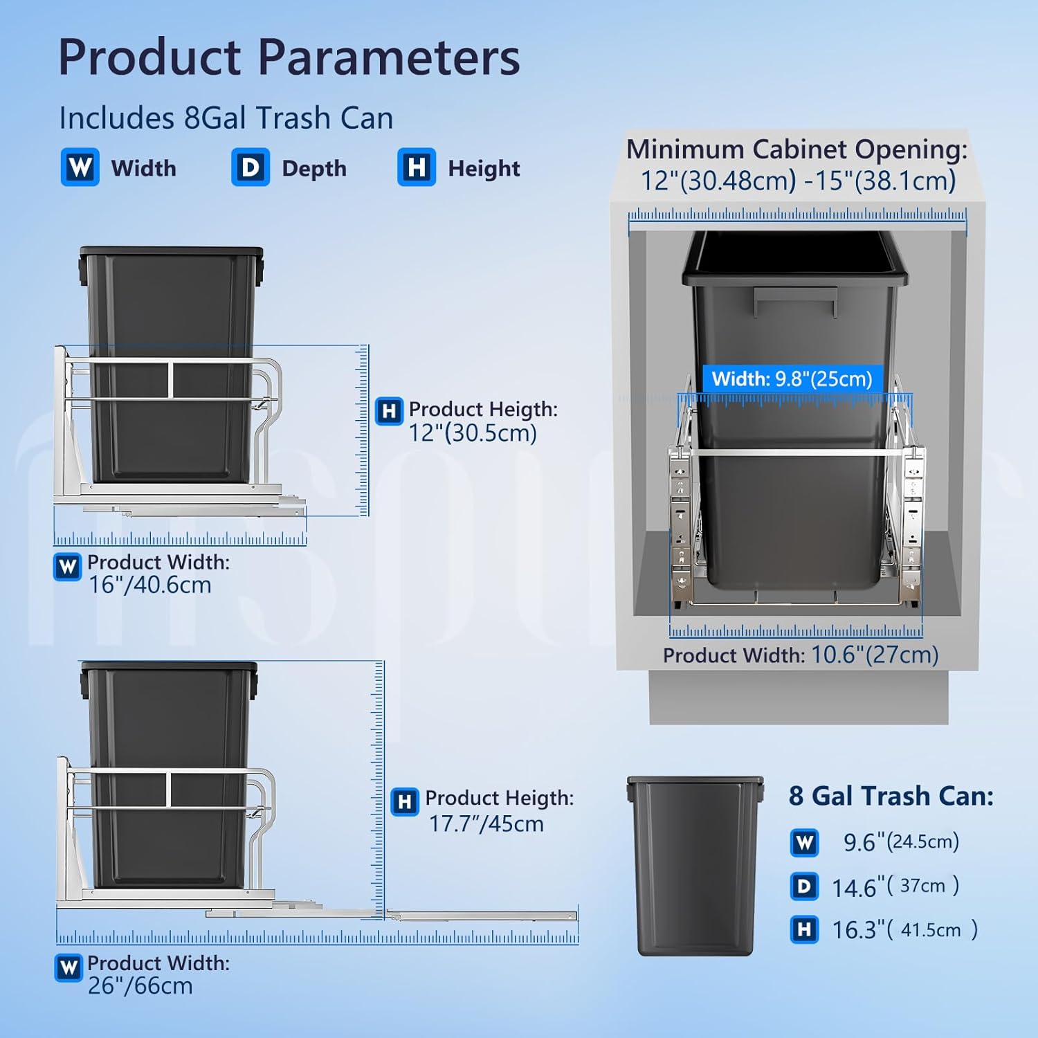 - Minimum cabinet size required: 18" D x 12" W x 21" H; slide-out trash can size: 10.6“ W x 16” D x 17.7” H (height of trash can included). Note: The screws that link to the cabinet door are 12mm (0.47“), so the minimum thickness of the door needs to be 15mm (0.59”) or more. When using under the sink and in cabinets, please measure the size and space to make sure the product fits in your cabinets