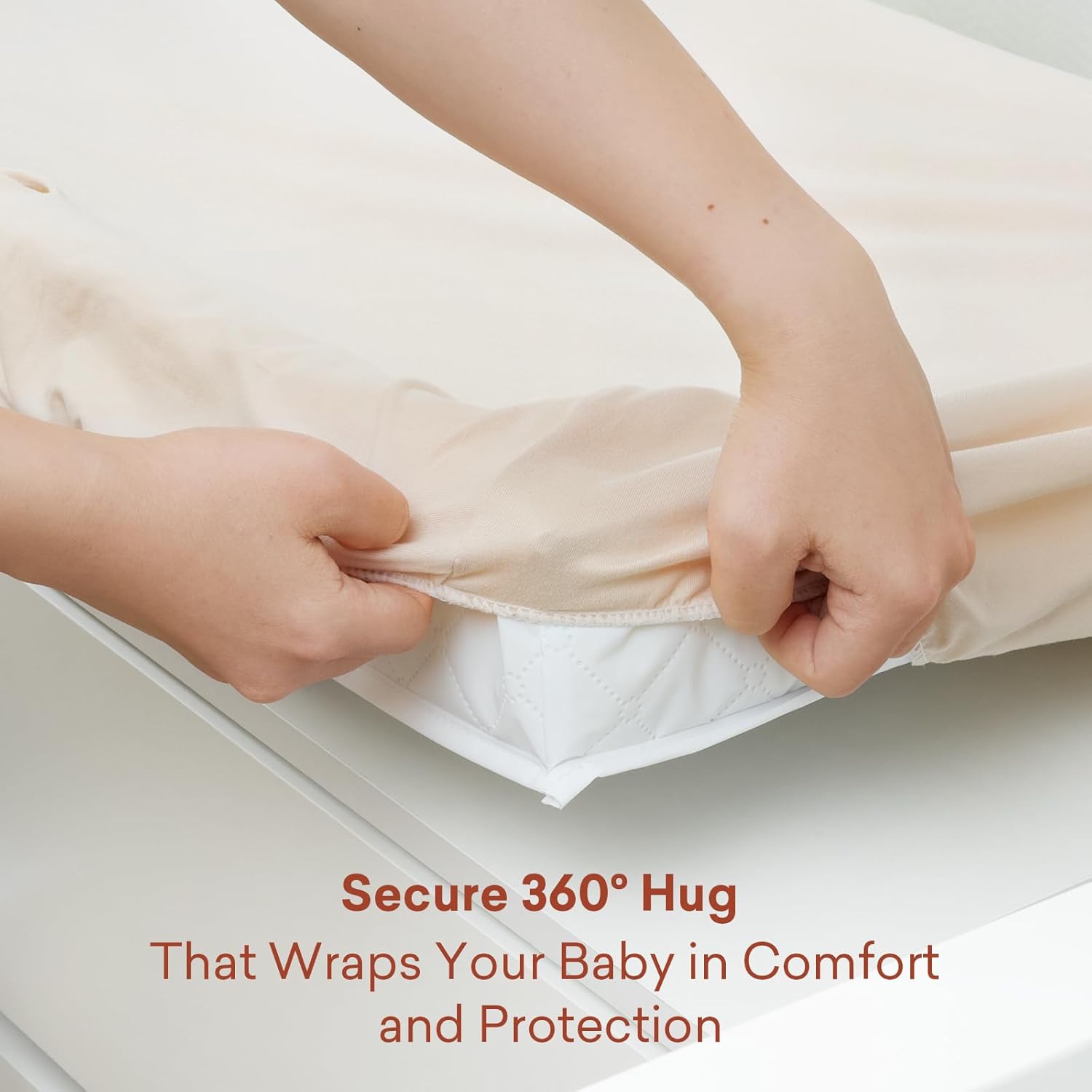 • 𝐏𝐞𝐫𝐟𝐞𝐜𝐭 𝐅𝐢𝐭 𝐟𝐨𝐫 𝐒𝐭𝐚𝐧𝐝𝐚𝐫𝐝 𝐂𝐡𝐚𝐧𝐠𝐢𝐧𝐠 𝐏𝐚𝐝𝐬: Designed to fit most standard-sized changing pads (32" x 16"), these fitted covers offer a secure and snug fit. The elastic edges ensure they stay in place, while built-in openings for safety straps provide added security and convenience for your baby’s safety during every diaper change.