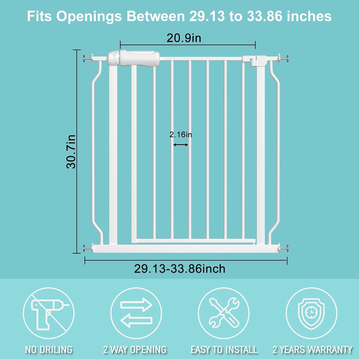 WAOWAO Baby Gate 29.13-33.82" Extra Wide Pressure Mounted Walk Through Swing Auto Close Safety White Metal Toddler Kids Child Dog Pet Puppy for Stairs,Doorways,Kitchen