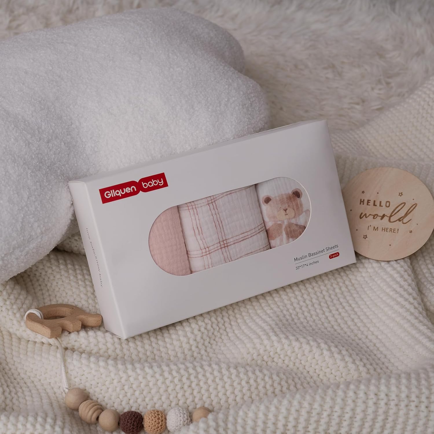 Gllquen Baby Muslin Bassinet Sheets 3 Pack, Breathable Elastic Cozy Fitted Cotton Bassinet Mattress Sheet for Baby Boy Girls, Fit for Hourglass Oval Rectangular Cradle Pad Sheets 33"x17" (Bear Dream)