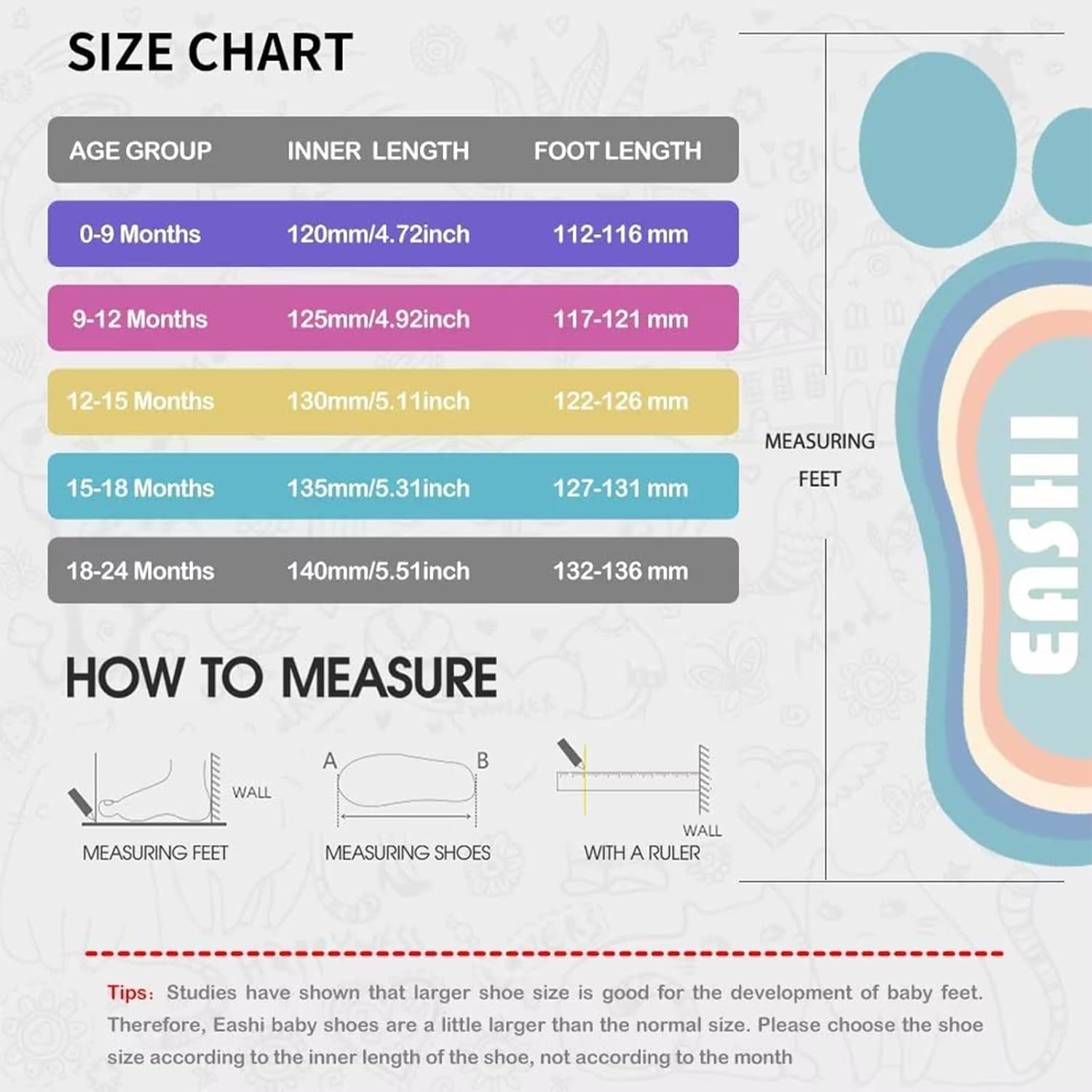 • Five Size for Choice : Fits up to 0-9 Month (3.5), 9-12 Month (4.5), 12-15 Month (5), 15-18 Month (6), 18-24 Month (6.5). Very soft, comfy and stretchy. Baby shoes are easy to clean, hand & machine washable.Regular sizes are for reference only. Please refer to the size chart on the product page and choose the appropriate size based on the actual measurement results