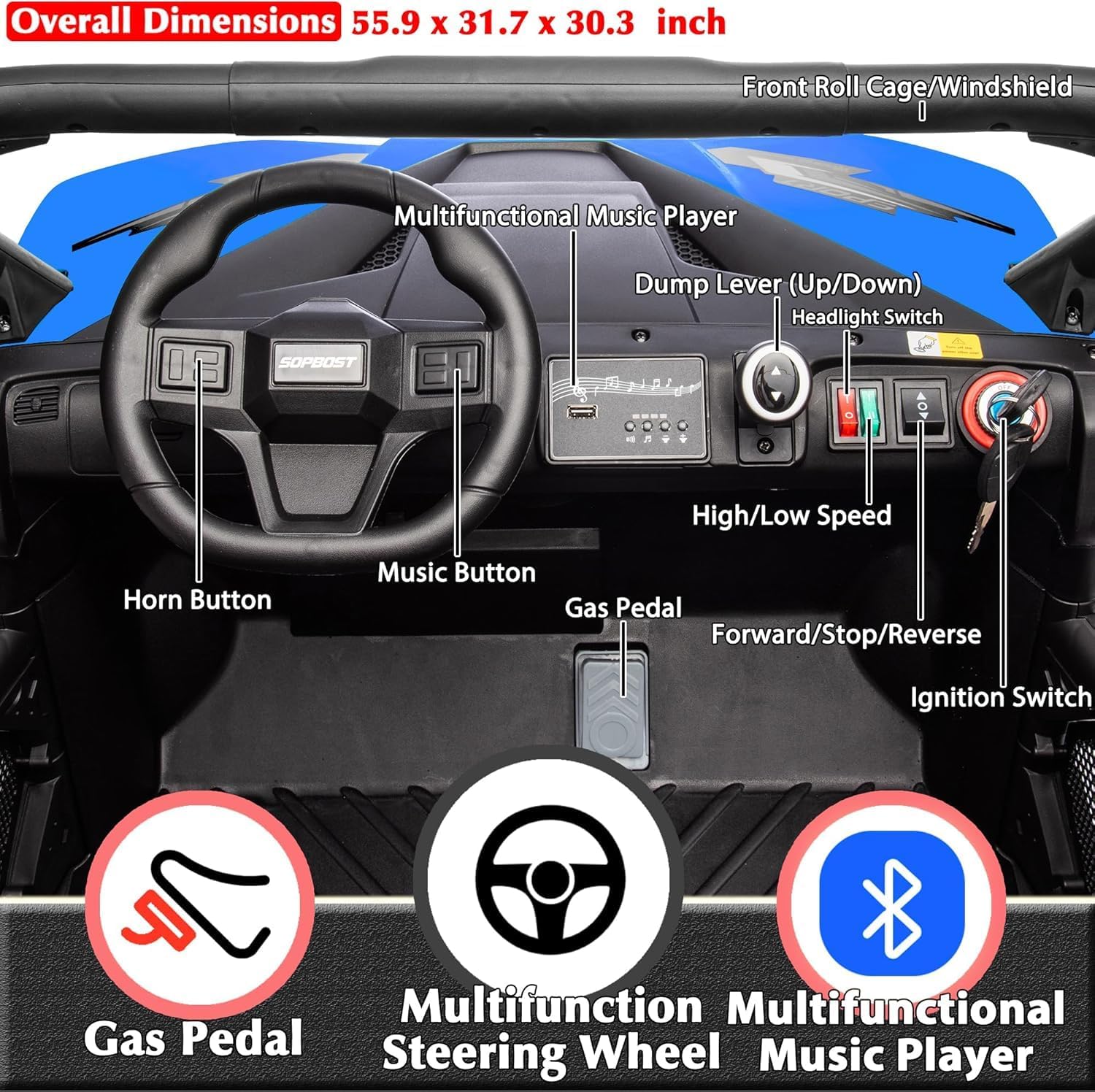 - Kids’ UTV with 1.4 Cu.Ft Dump Bed: The dump bed of this kids’ UTV is electric, kids can lift and down the dump bed by operating the joystick and handle, and it comes with a plastic shovel, your little kids can enjoy a transport experience with this side-by-side UTV. And the multifunctional music panel provides built-in music and devices connection functions (AUX/USB interface and wireless connection), enhances entertainments of this kids' toy car.