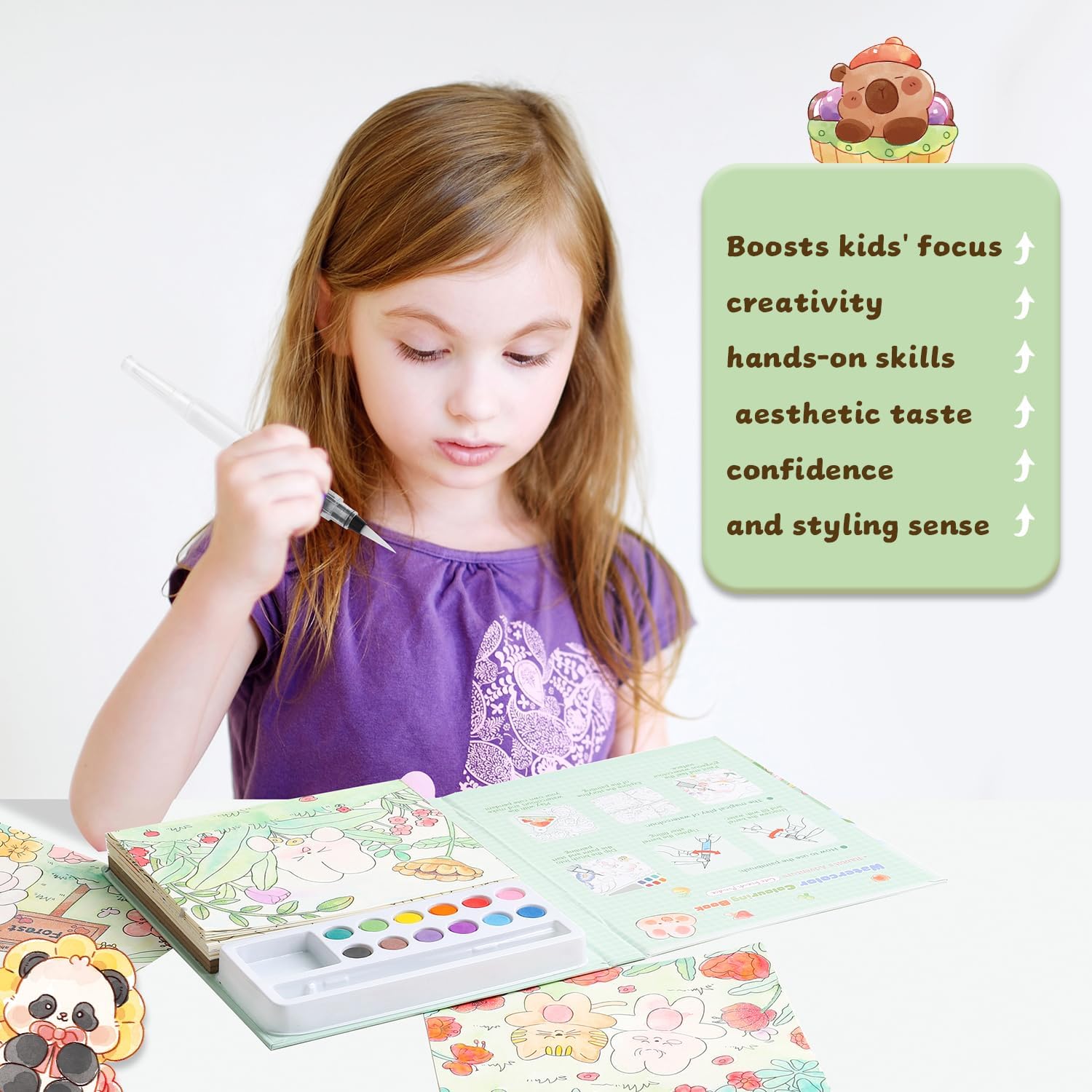• Keeps Kids Engaged and Boosts Multiple Skills This magical water coloring book captivates children's attention for extended periods, helping enhance their focus, fine motor skills, color coordination, creativity, confidence, and aesthetic awareness. Let kids explore a colorful world filled with imagination and fun.
