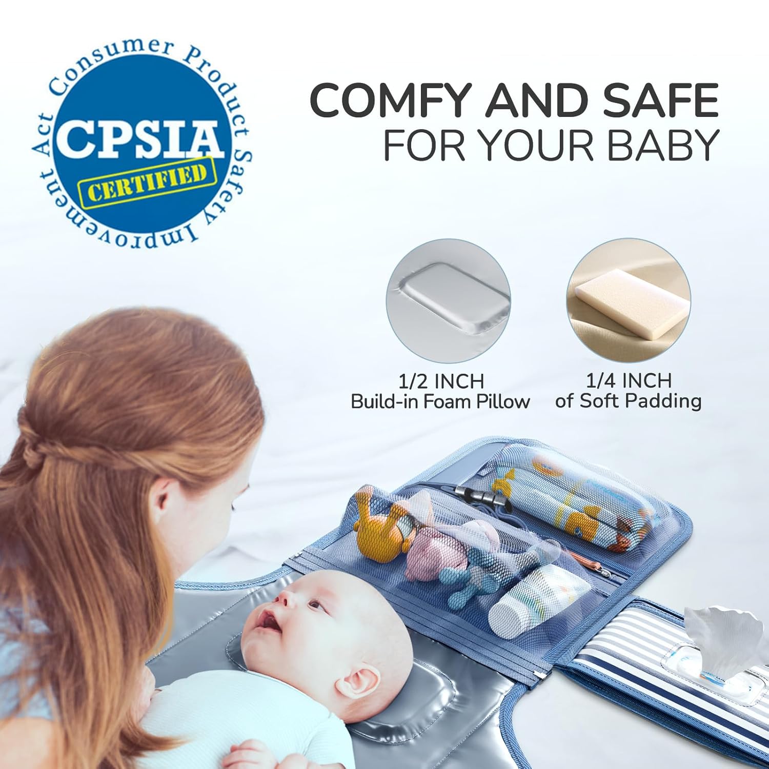• EASY TO CLEAN AND COMFY FOR BABY. The Alatino Portable Changing Pad is made of premium materials The high-quality padded surface features a built-in ½ inch memory foam pillow to cushion your baby’s head. Also, the waterproof material surface makes it easy to clean with a quick wipe down when messes happen.