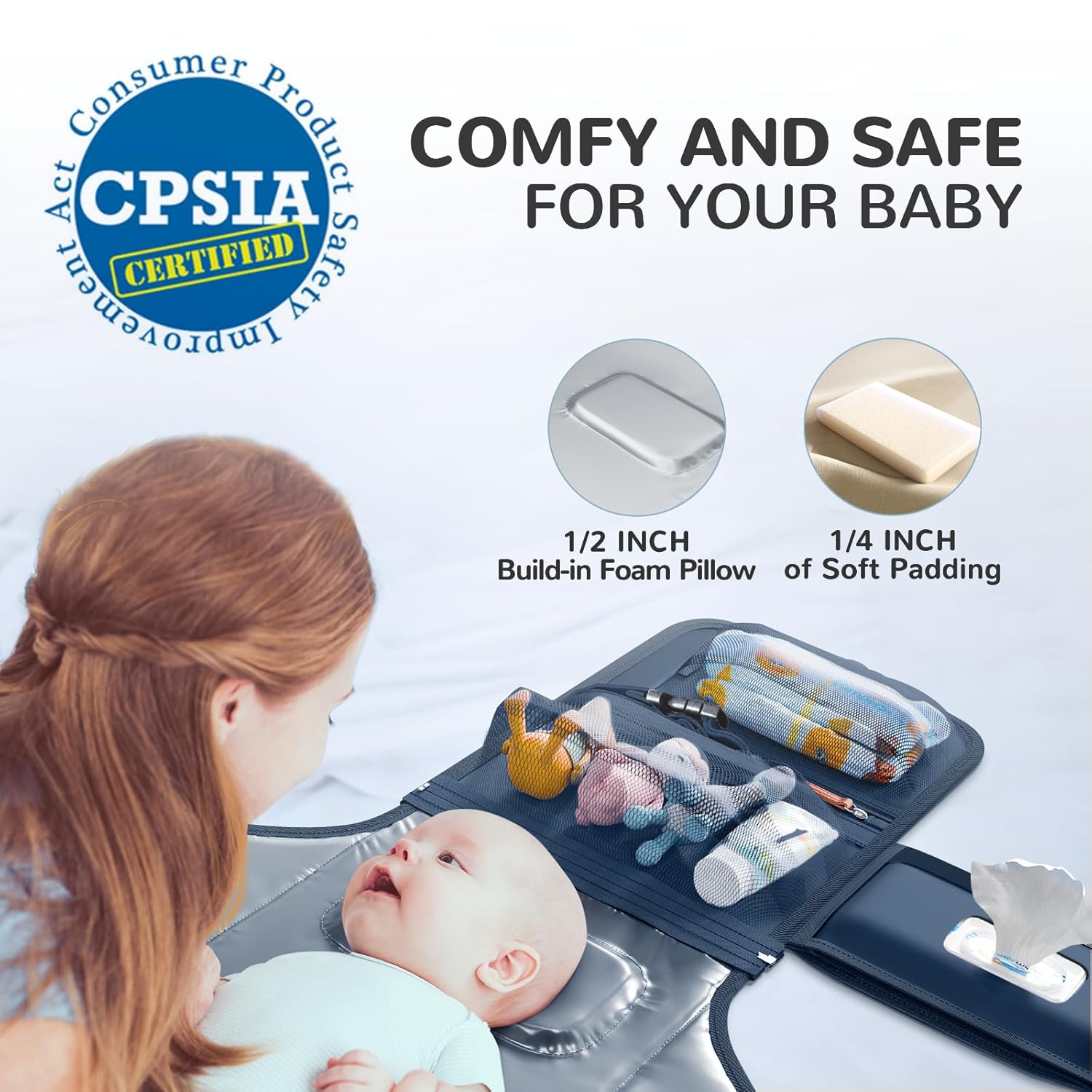 • EASY TO CLEAN AND COMFY FOR BABY. The Alatino Portable Changing Pad is made of premium materials The high-quality padded surface features a built-in ½ inch memory foam pillow to cushion your baby’s head. Also, the waterproof material surface makes it easy to clean with a quick wipe down when messes happen.