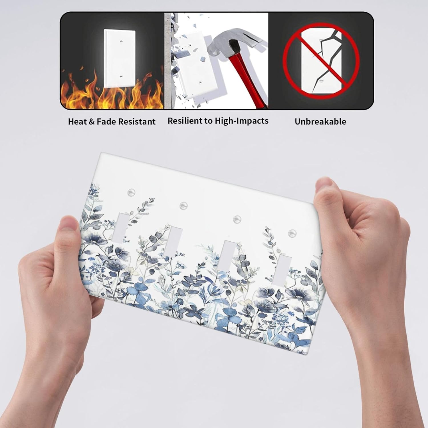 Light Switch Covers Light Blue Watercolor Leaves Plant With Floral Quad Toggle Electrical Faceplate 4 Gang Wall Plate Decorative Switch Plates for Bedroom Bathroom Decor