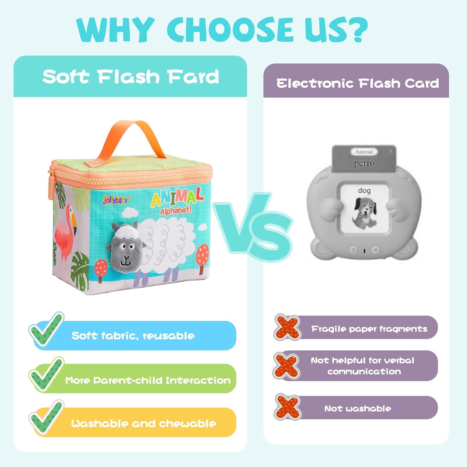 Jollybaby Reusable Soft Cloth ABC Alphabet/Letters Animal Flash Cards for Baby 0-3-6-9-12-18 Month, Curious Baby First Words Learning Activity Flashcards, Tummy Time Toy Gift for 1 Year Old Boy Girl