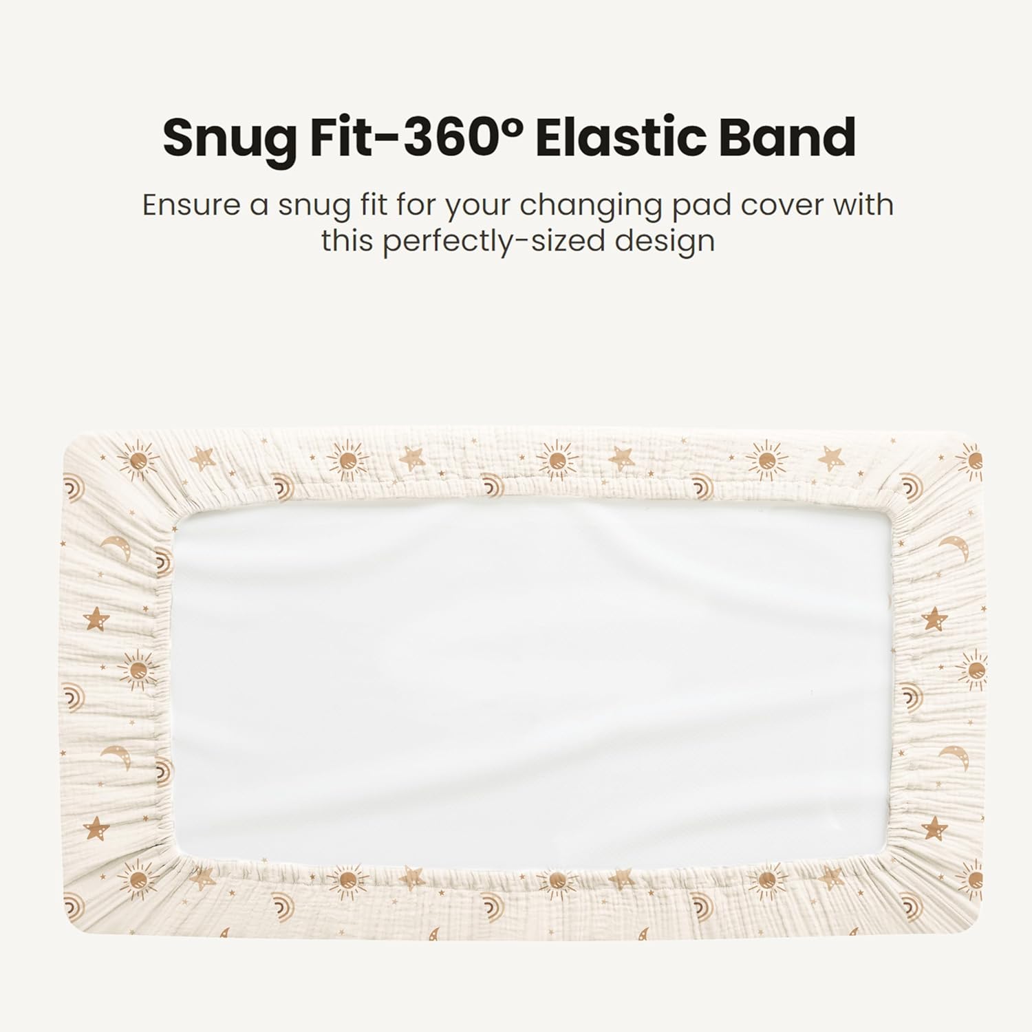 • Snug Fit: Our muslin changing pad cover measures 32” x 16”and features a fully encased 360-degree elastic. This design ensures a snug and secure fit on your changing pad. Say goodbye to slipping covers during diaper changes!