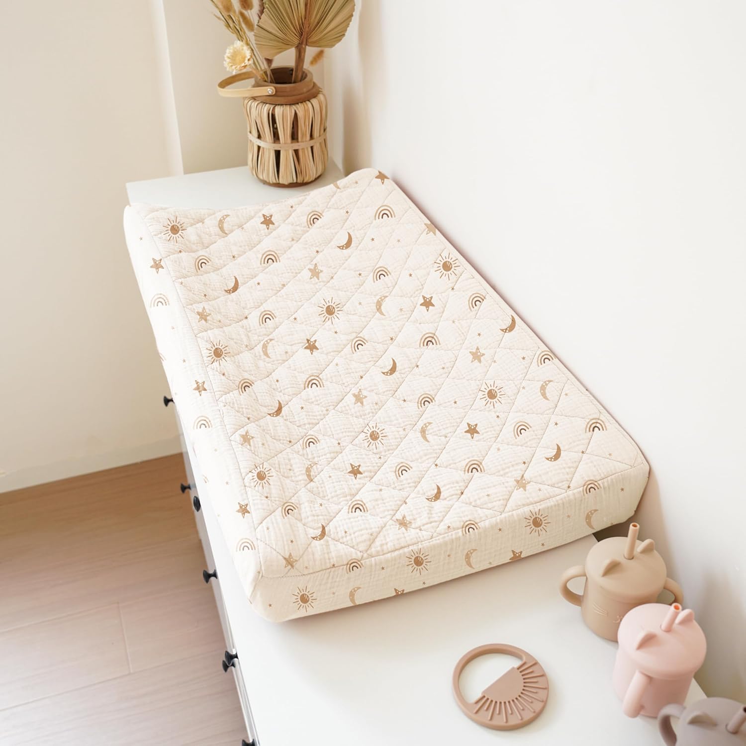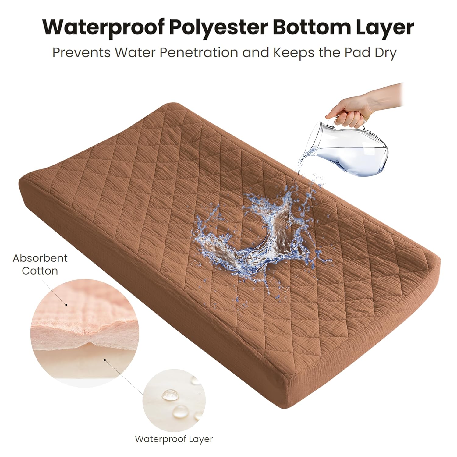 • Quilted and Soft Fabric: Our changing pad cover consists of three layers: the top layer is made of 100% cotton (muslin), which is soft and absorbent; the middle layer is quilted with soft padding to ensure coziness and comfort; and the bottom layer is made of 100% waterproof polyester to protect the pad from wetting. Our unique design provides a comfortable touch for your baby while ensuring waterproof functionality, making our changing pad soft and perfect for delicate baby skin.