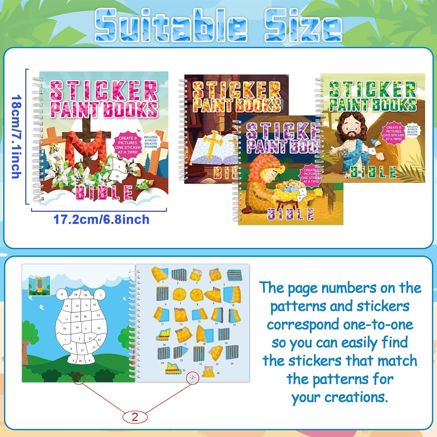 4Pcs Bible Paint by Sticker Books Sticker by Number Books Activity Book Stickers Puzzle Book Christian Craft Art Gift Set Party Favor with Jesus Bible Cross 32 Pictures